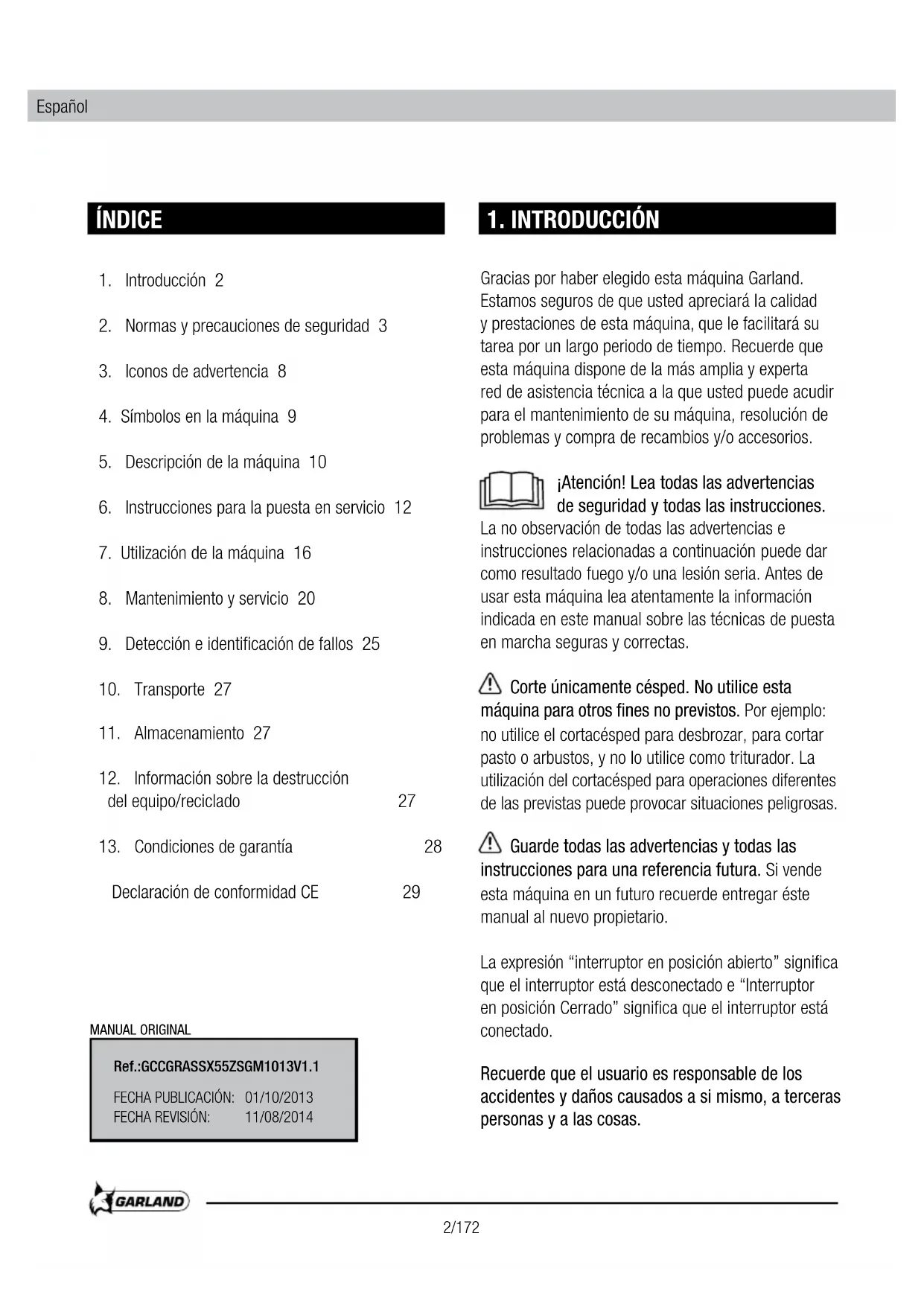 Gracias por haber elegido estaquina Garland. Estamos seguros de que usted appreciará la calidad y prestaciones de estaquina, que le fácilará suarea por un长大o periodo de tiempo. Recuerde que estaquina dispone de la más amplía y expertarede asistencia技术水平a que usted pueda acudirpara el mantenimiento de suquina,Resolution deproblemas y comprade recambios y/o accesorios.