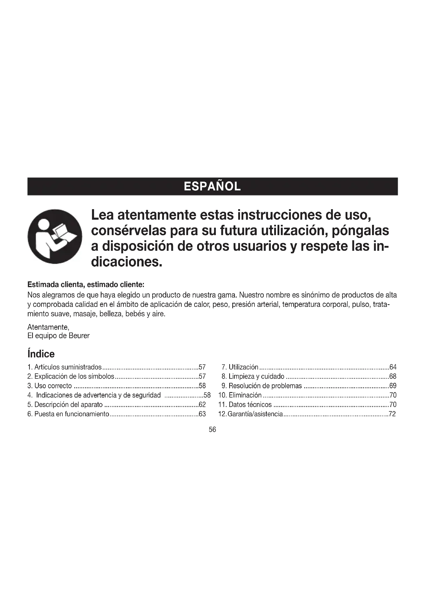 dicaciones. Estimada clienta, estimado cliente: Nos alegramos de que haya elegido un producto de nuestra gama. Nuestro nombre es sinónimo de productos de alta y comprobada calidad en el ámbito de aplicación de calor, peso, presión arterial, temperatura corporal, pulso, trata- miento suave, masaje, belleza, bebés y aire. Atentamente, El equipo de Beurer Índice