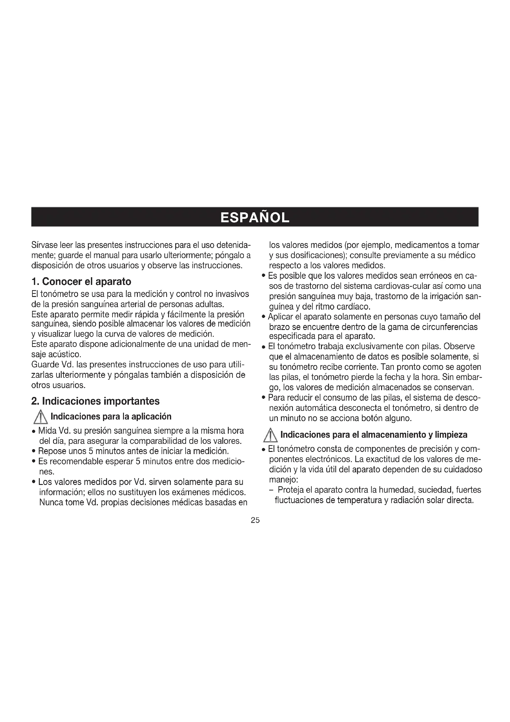 El tonómetro se usa para la medición y control no invasivos de la presión sanguínea arterial de personas adultas. Este aparato permite medir rápida y fácilmente la presión sanguínea, siendo posible almacenar los valores de medición y visualizar luego la curva de valores de medición. Este aparato dispone adicionalmente de una unidad de men- saje acústico. Guarde Vd. las presentes instrucciones de uso para utili- zarlas ulteriormente y póngalas también a disposición de otros usuarios.