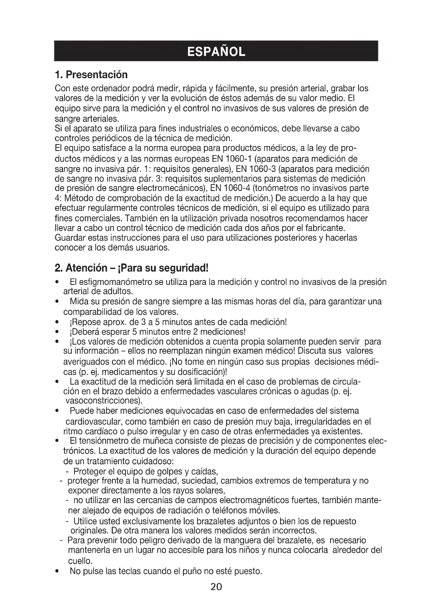 Con este ordenador podrá medir, rápida y fácilmente, su presión arterial, grabar los valores de la medición y ver la evolución de éstos además de su valor medio. El equiposirveparalamediciónyelcontrolnoinvasivosdesusvaloresdepresiónde sangre arteriales. Si el aparato se utiliza para fines industriales o económicos, debe llevarse a cabo controles periódicos de la técnica de medición. Elequiposatisfacealanormaeuropeaparaproductosmédicos,alaleydepro- ductos médicos y a las normas europeas EN 1060-1 (aparatos para medición de sangrenoinvasivapár.1:requisitosgenerales),EN1060-3(aparatosparamedición desangrenoinvasivapár.3:requisitossuplementariosparasistemasdemedición de presión de sangre electromecánicos), EN 1060-4 (tonómetros no invasivos parte 4:Métododecomprobacióndelaexactituddemedición.)Deacuerdoalahayque efectuarregularmentecontrolestécnicosdemedición,sielequipoesutilizadopara fines comerciales. También en la utilización privada nosotros recomendamos hacer llevar a cabo un control técnico de medición cada dos años por el fabricante. Guardar estas instrucciones para el uso para utilizaciones posteriores y hacerlas conocer a los demás usuarios.