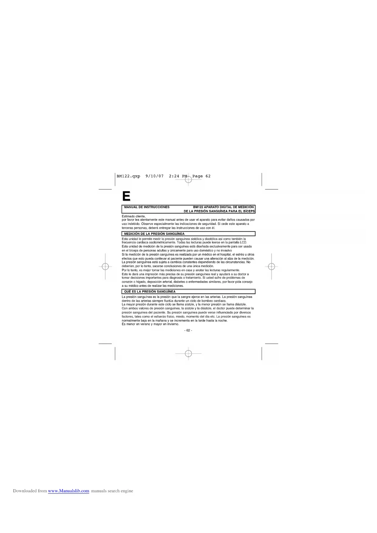 MANUAL DE INSTRUCCIONES BM122 APARATO DIGITAL DE MEDICIÓN DE LA PRESIÓN SANGUÍNEA PARA EL BÍCEPS Estimado cliente, por favor lea atentamente este manual antes de usar el aparato para evitar daños causados por uso indebido. Observe especialmente las indicaciones de seguridad. Si cede este aparato a terceras personas, deberá entregar las instrucciones de uso con él. MEDICIÓN DE LA PRESIÓN SANGUÍNEA Esta unidad le permite medir la presión sanguínea sistólica y diastólica así como también la frecuencia cardiaca oscilométricamente. Todas las lecturas puede leerse en la pantalla LCD. Esta unidad de medición de la presión sanguínea está diseñada exclusivamente para ser usada en el bíceps de personas adultas y únicamente para uso doméstico y no invasivo Si la medición de la presión sanguínea es realizada por un médico en el hospital, el estrés u otros efectos que esto pueda conllevar al paciente pueden causar una alteración al alza de la medición. La presión sanguínea está sujeta a cambios constantes dependiendo de las circunstancias. No deberían, por lo tanto, sacarse conclusiones de una única medición. Por lo tanto, es mejor tomar las mediciones en casa y anotar las lecturas regularmente. Esto le dará una impresión más precisa de su presión sanguínea real y ayudará a su doctor a tomar decisiones importantes para diagnosis o tratamiento. Si usted sufre de problemas de corazón o hígado, deposición arterial, diabetes o enfermedades similares, por favor pida consejo a su médico antes de realizar las mediciones. QUÉ ES LA PRESIÓN SANGUÍNEA La presión sanguínea es la presión que la sangre ejerce en las arterias. La presión sanguínea dentro de las arterias siempre fluctúa durante un ciclo de bombeo cardiaco. La mayor presión durante este ciclo se llama sístole, y la menor presión se llama diástole. Con ambos valores de presión sanguínea, la sístole y la diástole, el doctor puede determinar la presión sanguínea del paciente. Su presión sanguínea puede verse influenciada por diversos factores, tales como el esfuerzo físico, miedo, momento del día etc. La presión sanguínea es normalmente baja en la mañana y se incrementa en la tarde hasta la noche. Es menor en verano y mayor en invierno. BM122.qxp 9/10/07 2:24 PM Page 62 Downloaded from www.Manualslib.com manuals search engine- 63 -