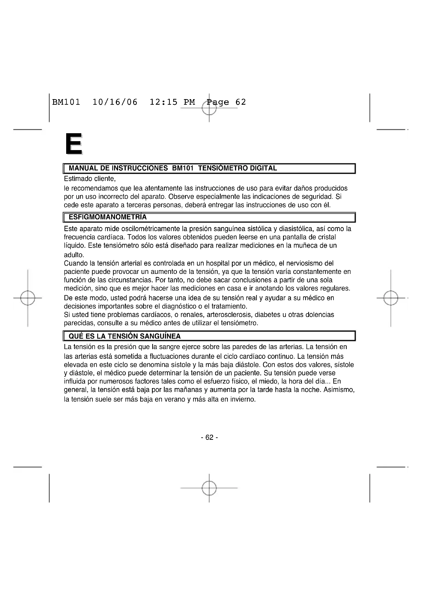 - Los valores obtenidos con este aparato se corresponden con los del experto que mide la tensión con una banda o con un estetoscopio. Los valores de medición se encuentran dentro de los límites fijados por la Normalización Nacional para tensiómetros electrónicos y automatizados de Estados Unidos. BM101 10/16/06 12:15 PM Page 64- 65 -