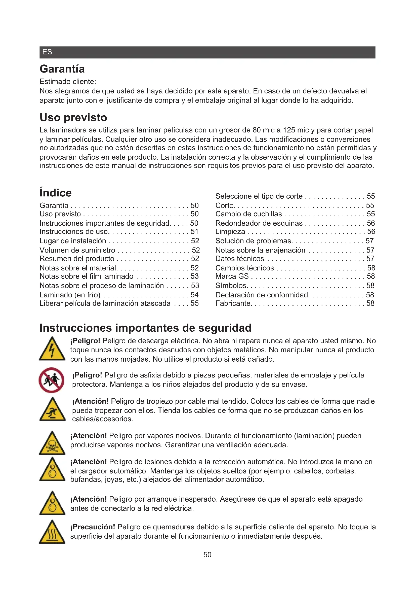 - Garantía Estimado cliente: Nos alegramos de que usted se haya decidido por este aparato. En caso de un defecto devuelva el aparato junto con el justicante de compra y el embalaje original al lugar donde lo ha adquirido. Uso previsto La laminadora se utiliza para laminar películas con un grosor de 80 mic a 125 mic y para cortar papel y laminar películas. Cualquier otro uso se considera inadecuado. Las modicaciones o conversiones no autorizadas que no estén descritas en estas instrucciones de funcionamiento no están permitidas y provocarán daños en este producto. La instalación correcta y la observación y el cumplimiento de las instrucciones de este manual de instrucciones son requisitos previos para el uso previsto del aparato. Índice Garantía p. 50