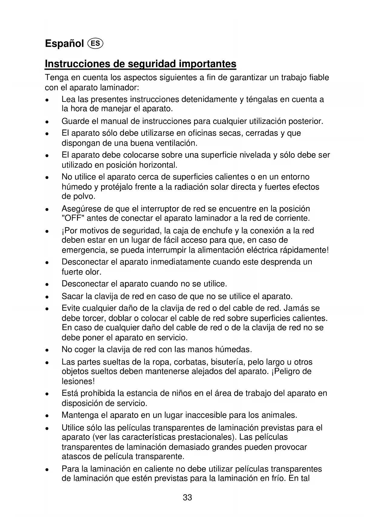 1 EWR = Espace économique européen qui comprend les États-membres de l'Union européenne plus les États Islande, Liechtenstein et Norvège.33 Español Instrucciones de seguridad importantes Tenga en cuenta los aspectos siguientes a fin de garantizar un trabajo fiable con el aparato laminador: ● Lea las presentes instrucciones detenidamente y téngalas en cuenta a la hora de manejar el aparato. ● Guarde el manual de instrucciones para cualquier utilización posterior. ● El aparato sólo debe utilizarse en oficinas secas, cerradas y que dispongan de una buena ventilación. ● El aparato debe colocarse sobre una superficie nivelada y sólo debe ser utilizado en posición horizontal. ● No utilice el aparato cerca de superficies calientes o en un entorno húmedo y protéjalo frente a la radiación solar directa y fuertes efectos de polvo. ● Asegúrese de que el interruptor de red se encuentre en la posición "OFF" antes de conectar el aparato laminador a la red de corriente. ● ¡Por motivos de seguridad, la caja de enchufe y la conexión a la red deben estar en un lugar de fácil acceso para que, en caso de emergencia, se pueda interrumpir la alimentación eléctrica rápidamente! ● Desconectar el aparato inmediatamente cuando este desprenda un fuerte olor. ● Desconectar el aparato cuando no se utilice. ● Sacar la clavija de red en caso de que no se utilice el aparato. ● Evite cualquier daño de la clavija de red o del cable de red. Jamás se debe torcer, doblar o colocar el cable de red sobre superficies calientes. En caso de cualquier daño del cable de red o de la clavija de red no se debe poner el aparato en servicio. ● No coger la clavija de red con las manos húmedas. ● Las partes sueltas de la ropa, corbatas, bisutería, pelo largo u otros objetos sueltos deben mantenerse alejados del aparato. ¡Peligro de lesiones! ● Está prohibida la estancia de niños en el área de trabajo del aparato en disposición de servicio. ● Mantenga el aparato en un lugar inaccesible para los animales. ● Utilice sólo las películas transparentes de laminación previstas para el aparato (ver las características prestacionales). Las películas transparentes de laminación demasiado grandes pueden provocar atascos de película transparente. ● Para la laminación en caliente no debe utilizar películas transparentes de laminación que estén previstas para la laminación en frío. En tal34 caso, el aparato, la película transparente de laminación y el documento sufrirían daños. ● No corte las películas transparentes de laminación a medida. Los cantos de corte generados pueden provocar atascos de película transparente. ● No utilice películas transparentes de laminación sucias. Si fuera necesario, limpie las mismas previamente con un paño suave y ligeramente húmedo. ● No se pueden laminar objetos metálicos. ● Con este aparato no deben laminarse materiales termosensibles como, por ejemplo, papel térmico. ● La laminación de documentos húmedos conlleva un mal resultado de laminación. ● Entre los procesos de laminación debe dejarse una pausa de al menos 15 segundos. ● Deje que el aparato se enfríe durante al menos 30 minutos después del servicio. ● Transporte el aparato únicamente cuando se haya enfriado. ● No entre en contacto con las partes calientes del aparato. ¡Peligro de quemaduras! También tenga cuidado a la hora de manejar la película transparente laminada. ¡Esta está muy caliente! Advertencias importantes ● Documentos Nacionales de Identidad y otros documentos pueden perder su validez, ya que después del laminado no es posible comprobar la autenticidad de los documentos. ● En caso de entregar el aparato laminador a otras personas, adjunte siempre las presentes instrucciones de uso. ● Cuando se pretende laminar materiales muy blandos (por ejemplo, servilletas) o formatos pequeños, entonces recomendamos colocar el producto a laminar en una hoja de papel doblada a fin de evitar posibles atascos. Esta hoja de papel doblada debe introducirse con el borde de doblado orientado hacia delante en el aparato laminador.35 Exclusión de responsabilidad No asumimos garantía alguna por la integridad de las informaciones que se refieren a características técnicas, así como a la presente documentación. El producto descrito en la presente documentación y, en caso dado, sus ac- cesorios, están sujetos a la mejora continua y al desarrollo ulterior. Por este motivo, nos reservamos el derecho a modificar en cualquier momento y sin previa notificación los componentes, accesorios, especificaciones técnicas, así como la presente documentación del producto. Uso previsto Este aparato laminador permite laminar en caliente o frío imágenes, tarjetas, documentos, papel, etc. Cualquier otro uso se considera no conforme al ob- jetivo previsto. Se prohíbe expresamente cualquier modificación o transfor- mación. Características prestacionales Protección y mejora de sus documentos. Permite laminar fotos, documentos, gráficos, etc. de un tamaño de hasta DIN A3 (A 3024, A 3048) o DIN A4 (A 2024, A 2048). El aparato funciona con 4 rodillos calefactores (A 2048, A 3048) o con 2 ro- dillos calefactores (A 2024, A 3024), tiene un tiempo de calentamiento rápido y lamina sin materias portantes.