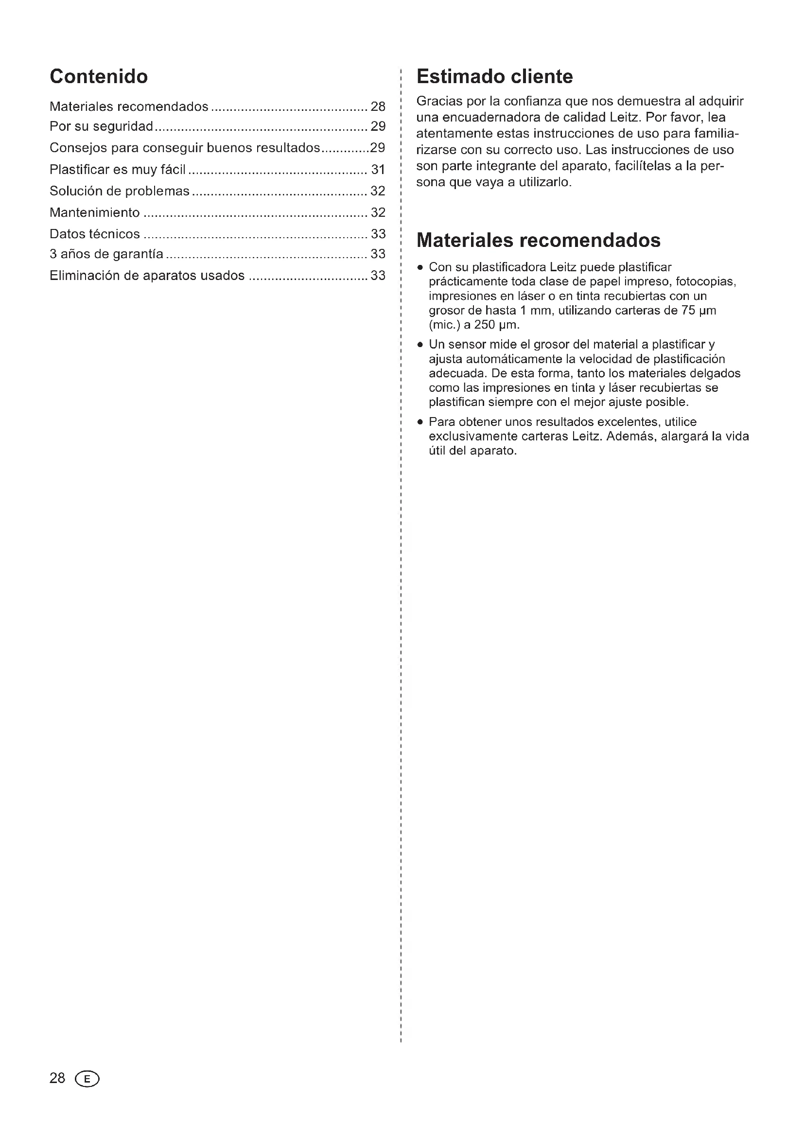 E E Estimado cliente Gracias por la conanza que nos demuestra al adquirir una encuadernadora de calidad Leitz. Por favor, lea atentamente estas instrucciones de uso para familia- rizarse con su correcto uso. Las instrucciones de uso son parte integrante del aparato, facilítelas a la per- sona que vaya a utilizarlo. Materiales recomendados