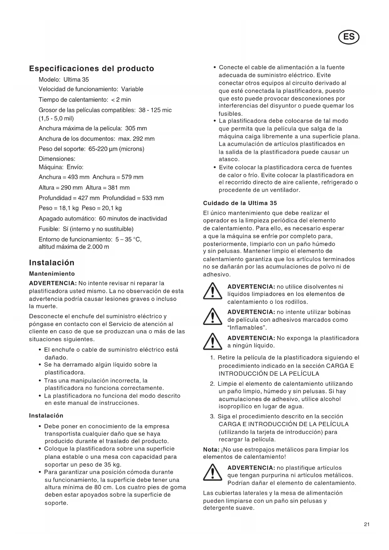 macchina in reverse. Aerrare le estremità libere21 Especificaciones del producto Modelo: Ultima 35 Velocidad de funcionamiento: Variable Tiempo de calentamiento: < 2 min Grosor de las películas compatibles: 38 - 125 mic (1,5 - 5,0 mil) Anchura máxima de la película: 305 mm Anchura de los documentos: max. 292 mm Peso del soporte: 65-220 μm (microns) Dimensiones: Máquina: Envío: Anchura = 493 mm Anchura = 579 mm Altura = 290 mm Altura = 381 mm Profundidad = 427 mm Profundidad = 533 mm Peso = 18,1 kg Peso = 20,1 kg Apagado automático: 60 minutos de inactividad Fusible: Sí (interno y no sustituible) Entorno de funcionamiento: 5 – 35 °C, altitud máxima de 2.000 m Instalación Mantenimiento ADVERTENCIA: No intente revisar ni reparar la plastificadora usted mismo. La no observación de esta advertencia podría causar lesiones graves o incluso la muerte. Desconecte el enchufe del suministro eléctrico y póngase en contacto con el Servicio de atención al cliente en caso de que se produzcan una o más de las situaciones siguientes.