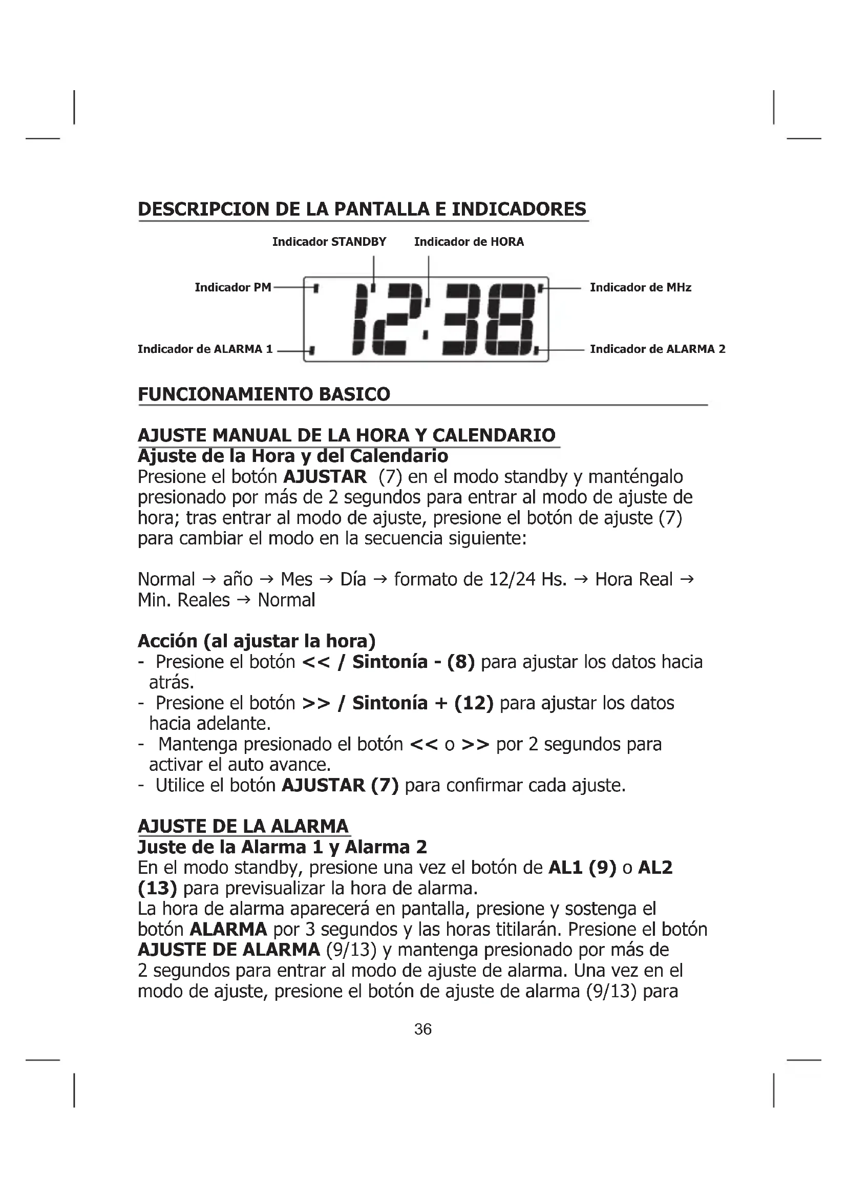 FUNCIONAMIENTO BASICO AJUSTE MANUAL DE LA HORA Y CALENDARIO Ajuste de la Hora y del Calendario Presione el botón AJUSTAR (7) en el modo standby y manténgalo presionado por más de 2 segundos para entrar al modo de ajuste de hora; tras entrar al modo de ajuste, presione el botón de ajuste (7) para cambiar el modo en la secuencia siguiente: Normal g año g Mes g Día g formato de 12/24 Hs. g Hora Real g Min. Reales g Normal Acción (al ajustar la hora) - Presione el botón << / Sintonía - (8) para ajustar los datos hacia atrás. - Presione el botón >> / Sintonía + (12) para ajustar los datos hacia adelante. - Mantenga presionado el botón << o >> por 2 segundos para activar el auto avance. - Utilice el botón AJUSTAR (7) para conrmar cada ajuste.