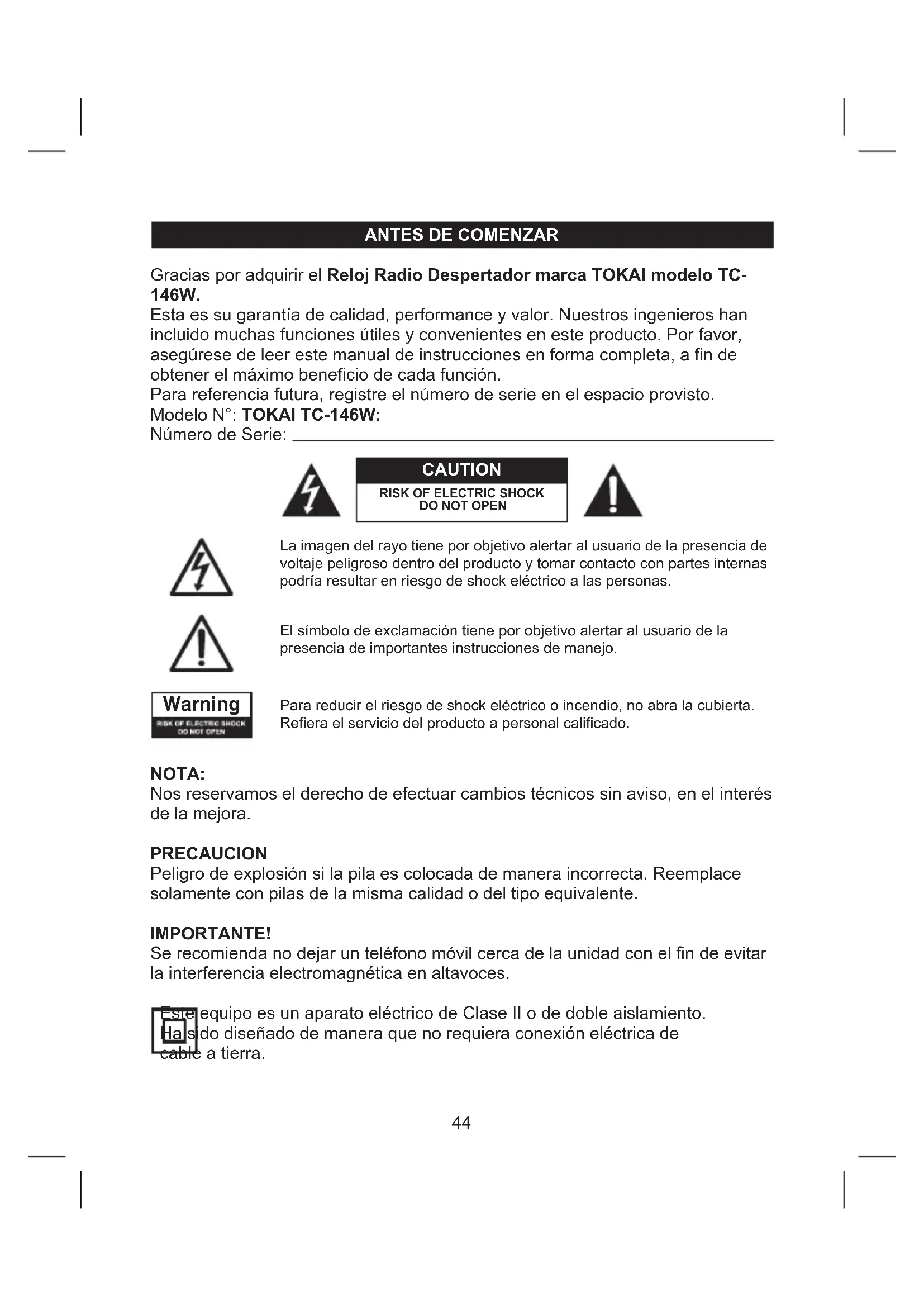 Atencion ! Este juego de logo sobre el producto quiere decir que el reciclaje de este aparato viene dentro del marco de la Directiva 2002/96/CE del 27 de enero de 2003 concernir la Basura(el Gasto) de Equipo Eléctrico y Electrónico (WEEE). Su producto esta marcado con este simbolo. Signica que los productos electricos y electronicos usados no deberian mezclarse con los residuos domesticos generales. Existe un sistema de recogida independiente para estos productos. Si quiere desechar este equipo, ¡por favor no utilice el cubo de la basura habitual ! - Los equipos electricos y electronicos usados deberian tratarse por separado de acuerdo con la legislacion que requiere un tratamiento, una recuperacion y un reciclaje adecuados de los equipos electricos y electronicos usados. Tras la puesta en practica por parte de los estados equipos electricos y electronicos usados. - Tras la puesta en practica por parte de los estados miembros, los hogares de pariculares dentro de los estados de la Union Europea pueden devolver sus equipos electricos y electronicos a los centros de recogida designados sin coste alguno. (Por favor, pongase en contacto con su autoridad local para obtener mas detalles). - Si sus equipos electricos o electronicos usados tienen pilas o acumuladores, por favor desechelos por separado con antelacion segun los requisitos locales. - Al desechar este producto correctamente, ayudara a asegurar que los residuos reciban el tratamiento, la recuperacion y el reciclaje necesarios, previniendo de esta forma posibles efectos negativos en el medio ambiente y la salud humana que de otra forma podrian producirse debido a una manipulacion de residuos inapropiada. Esta unidad cumple con el Consejo europeo la Directiva 2006 / 95 CE (la Compatibilidad Electromagnética y Directivas de Voltaje Bajas)VOR DEM EINSATZ Vielen Dank für den Kauf dieser Alarmuhr mit Radio TC-146W von TOKAI. Wir versichern Ihnen hiermit die Qualität, Leistung und den Wert dieses Produktes. Unsere Techniker haben dieses Gerät mit vielen nützlichen und einfach zu bedienenden Funktionen ausgestattet. Bitte lesen Sie diese Bedienungsanleitung vollständig vor dem Einsatz des Gerätes durch, um sicher zu stellen, dass Sie die Funktionen des Gerätes optimal nutzen können. Für Ihre Bezugnahme in der Zukunft sollten Sie die Seriennummer Ihres Gerätes in der nachfolgenden Zeile vermerken. Modell Nr.: TOKAI TC-146W : Seriennummer: WARNUNG HINWEIS: Im Interesse der Produktverbesserung behalten wir uns Änderungen technischer Daten und anderer Leistungsmerkmale ohne Vorankündigung vor. VORSICHT Es besteht Explosionsgefahr wenn die Batterie nicht korrekt eingelegt wird. Bitte ersetzen Sie die Batterie nur durch eine Batterie des vorgeschriebenen Typs oder eines äquivalenten Typs. WICHTIG! Es wird empfohlen, ein Mobiltelefon in der Nähe der Einheit zu verlassen, um elektromagnetische Störungen in den Lautsprechern zu vermeiden.