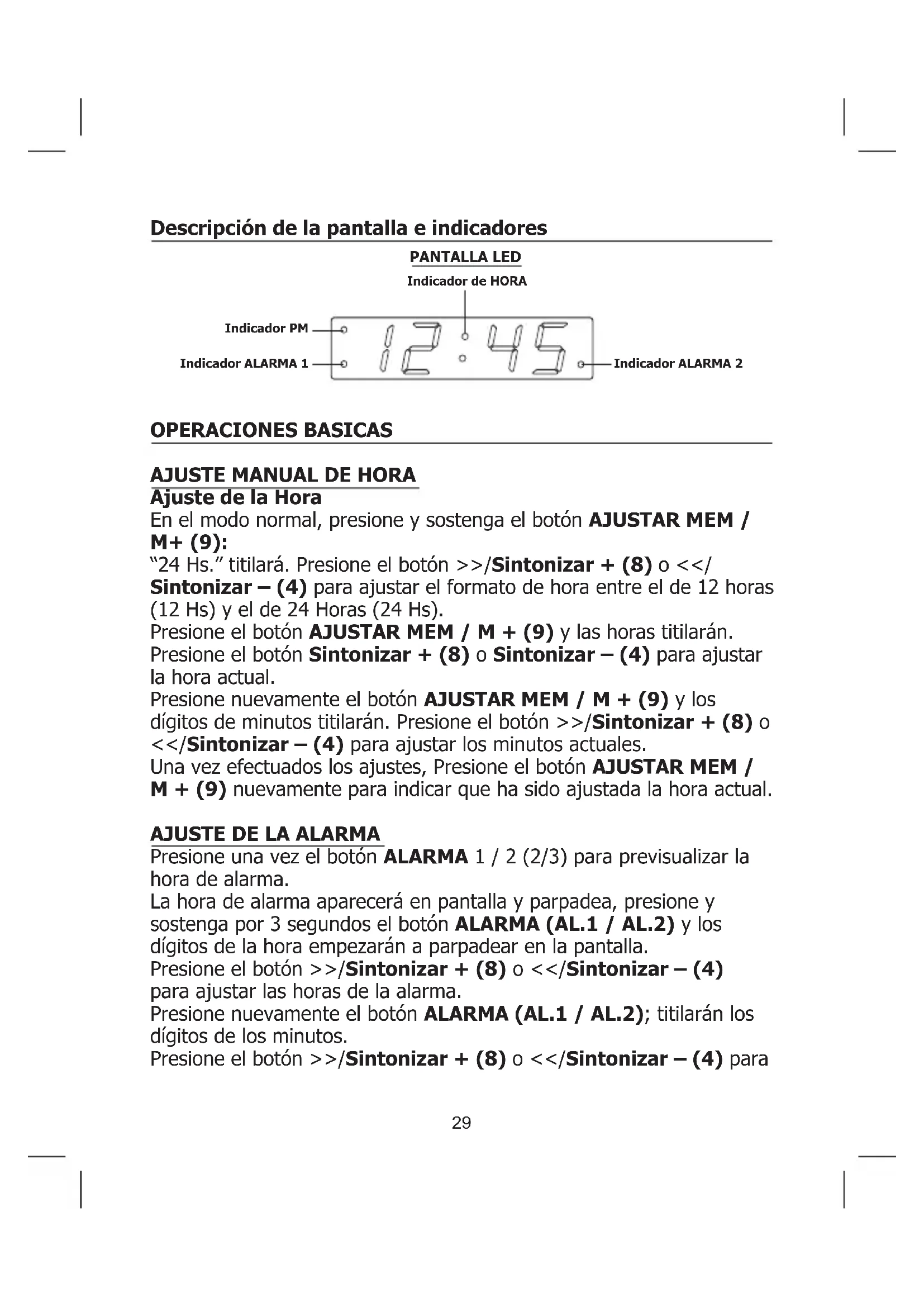Ajuste de la Hora En el modo normal, presione y sostenga el botón AJUSTAR MEM / M+ (9): “24 Hs.” titilará. Presione el botón >>/Sintonizar + (8) o <</ Sintonizar – (4) para ajustar el formato de hora entre el de 12 horas (12 Hs) y el de 24 Horas (24 Hs). Presione el botón AJUSTAR MEM / M + (9) y las horas titilarán. Presione el botón Sintonizar + (8) o Sintonizar – (4) para ajustar la hora actual. Presione nuevamente el botón AJUSTAR MEM / M + (9) y los dígitos de minutos titilarán. Presione el botón >>/Sintonizar + (8) o <</Sintonizar – (4) para ajustar los minutos actuales. Una vez efectuados los ajustes, Presione el botón AJUSTAR MEM / M + (9) nuevamente para indicar que ha sido ajustada la hora actual.