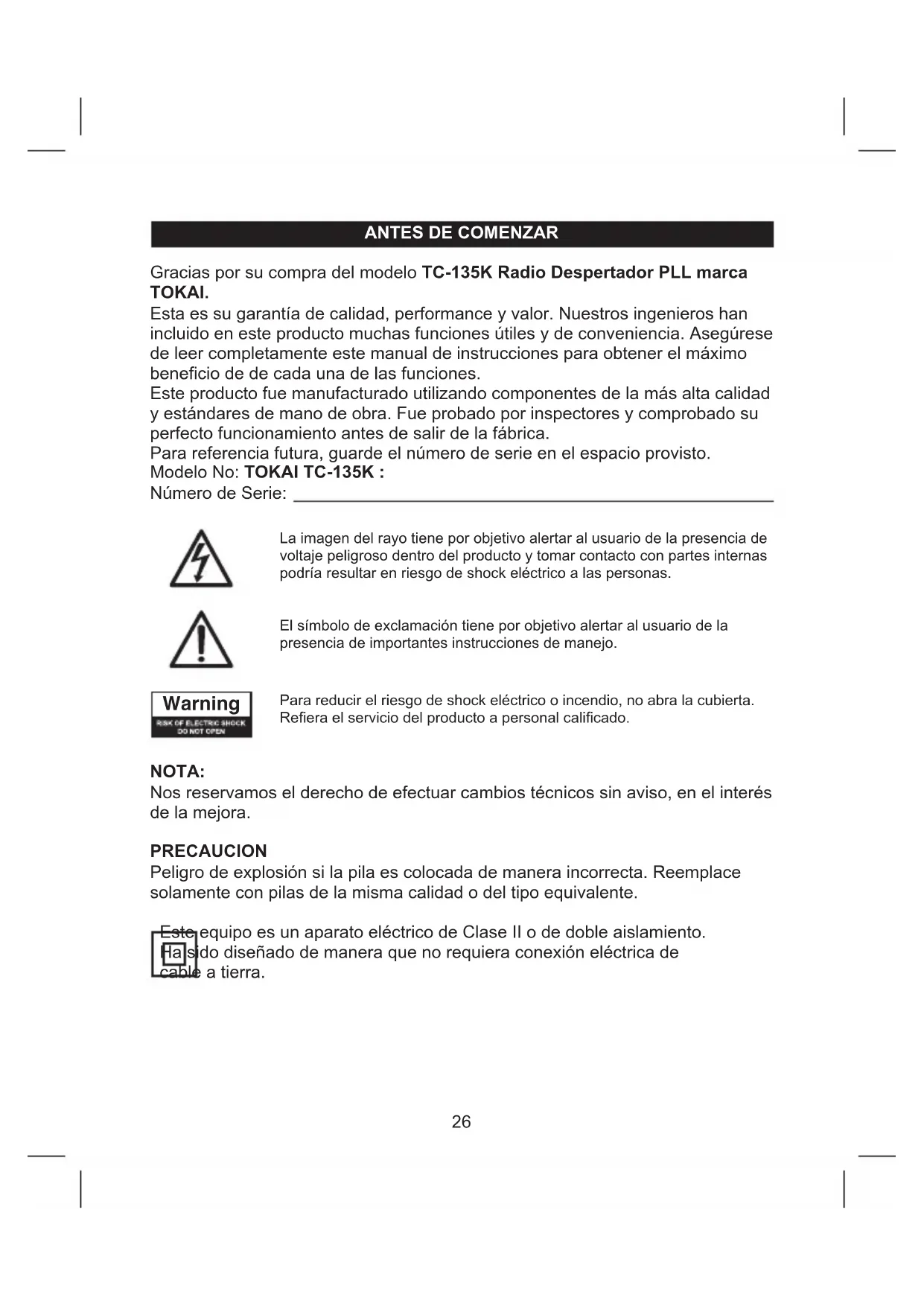 Presione el botón ENCENDIDO/APAGADO (4) para encender la unidad. Use el botón Sintonizar (5) o Sintonizar (1) para seleccionar la estación de FM deseada. Presionar el botón AJUSTE - MEM/M+ (2); “P02” titilará en la pantalla. Presionar nuevamente el botón AJUSTE - MEM/M+ (2) para preajustar una estación. Repita los pasos 2 al 4 para preajustar otras estaciones de radio. La unidad puede preajustar un total de 10 estaciones para FM. Cuando “P01-P10” esté titilando, presionar el botón Sintonizar (5) o32 Sintonizar (1) para seleccionar el número preajustado. Cuando llame las estaciones preajustadas, presione el botón AJUSTE - MEM/ M+ (2) para seleccionar el número preajustado. FUNCIONAMIENTO DE LA FUNCION DORMIR (SLEEP) Cuando se encuentre escuchando radio, presione el botón Snooze / DORMIR (3) para entrar al modo de dormir. Puede ajustar la hora del temporizador para dormirse desde los 90 min. a los 10 min. presionando el botón Snooze / DORMIR (3). La unidad se apagará automáticamente después de transcurrido el tiempo seleccionado. REAJUSTE Si el sistema no responde o exhibe funcionamiento errático o intermitente, puede haber experimentado una descarga electrostática (DES) o una subida de tensión que activó el microcontrolador interno para el apagado automático. Si ésto ocurriera, simplemente desconecte el cable de la corriente y remueva la pila del sistema de resguardo, espere al menos 3 minutos y vuelva a efectuar los ajustes de la unidad siguiendo el manual. ESPECIFICACIONES TECNICAS Alimentación AC230V~50Hz Consumo de Energía 5 W Consumo de Energía en Standby <1 W Radio Frecuencia FM 87.5 – 108 MHz Potencia de Salida de Audio 150MW Pila de Resguardo 3V (Pila CR2032 plana de litio x 1) no incluida Peso Neto 310 gr. Dimensiones 79 x 79 x 90 mm IMPORTANTE: Debido a la continua revisión y mejoras en el diseño de nuestros productos, las especicaciones quedan sujetas a cambio sin aviso previo.33 Desecho del producto Atencion ! Este juego de logo sobre el producto quiere decir que el reciclaje de este aparato viene dentro del marco de la Directiva 2002/96/CE del 27 de enero de 2003 concernir la Basura(el Gasto) de Equipo Eléctrico y Electrónico (WEEE). Su producto esta marcado con este simbolo. Signica que los productos electricos y electronicos usados no deberian mezclarse con los residuos domesticos generales. Existe un sistema de recogida independiente para estos productos. Si quiere desechar este equipo, ¡por favor no utilice el cubo de la basura habitual ! - Los equipos electricos y electronicos usados deberian tratarse por separado de acuerdo con la legislacion que requiere un tratamiento, una recuperacion y un reciclaje adecuados de los equipos electricos y electronicos usados. Tras la puesta en practica por parte de los estados equipos electricos y electronicos usados. Tras la puesta en practica por parte de los estados miembros, los hogares de pariculares dentro de los estados de la Union Europea pueden devolver sus equipos electricos y electronicos a los centros de recogida designados sin coste alguno. (Por favor, pongase en contacto con su autoridad local para obtener mas detalles). - Si sus equipos electricos o electronicos usados tienen pilas o acumuladores, por favor desechelos por separado con antelacion segun los requisitos locales. - Al desechar este producto correctamente, ayudara a asegurar que los residuos reciban el tratamiento, la recuperacion y el reciclaje necesarios, previniendo de esta forma posibles efectos negativos en el medio ambiente y la salud humana que de otra forma podrian producirse debido a una manipulacion de residuos inapropiada. Esta unidad cumple con el Consejo europeo la Directiva 2006 / 95 CE (la Compatibilidad Electromagnética y Directivas de Voltaje Bajas)BEVOR WIR BEGINNEN Vielen Dank für den Kauf der PLL Radio-Alarmuhr des Modells TC-135K von TOKAI. Unser Markenname garantiert Qualität, Leistung und Wert. Unsere Ingenieure haben dieses Gerät mit vielen nützlichen Funktionen ausgestattet. Bitte lesen Sie diese Bedienungsanleitung vor dem Gebrauch des Gerätes sorgfältig durch, um sicher zu sein dass Sie die Funktionen dieses Gerätes optimal nutzen können. Dieses Produkt wurde unter Verwendung qualitativ hochwertiger Komponenten und unter Einhaltung striktester Qualitätsnormen bei der Herstellung produziert. Es wurde von unseren Inspektoren im Werk getestet und in perfektem Zustand ab Werk versandt. Für die Bezugnahme in der Zukunft sollten Sie sich die Seriennummer im nachfolgenden Textfeld notieren. Modell Nr.: TOKAI TC-135K : Serien-Nummer: HINWEIS: Im Interesse der Produktverbesserung behalten wir uns Änderungen technischer Daten und anderer Leistungsmerkmale ohne Vorankündigung vor. VORSICHT Es besteht Explosionsgefahr wenn die Batterie nicht korrekt eingelegt wird. Bitte ersetzen Sie die Batterie nur durch eine Batterie des vorgeschriebenen Typs oder eines äquivalenten Typs. Dieses Gerät ist ein Elektrogerät der Sicherheitsklasse II, d.h. dieses Elektrogerät ist mit doppelter Isolierung ausgestattet. Es wurde so geschaffen, dass das Gerät keinen Schutzleiter und keine Erdung benötigt.