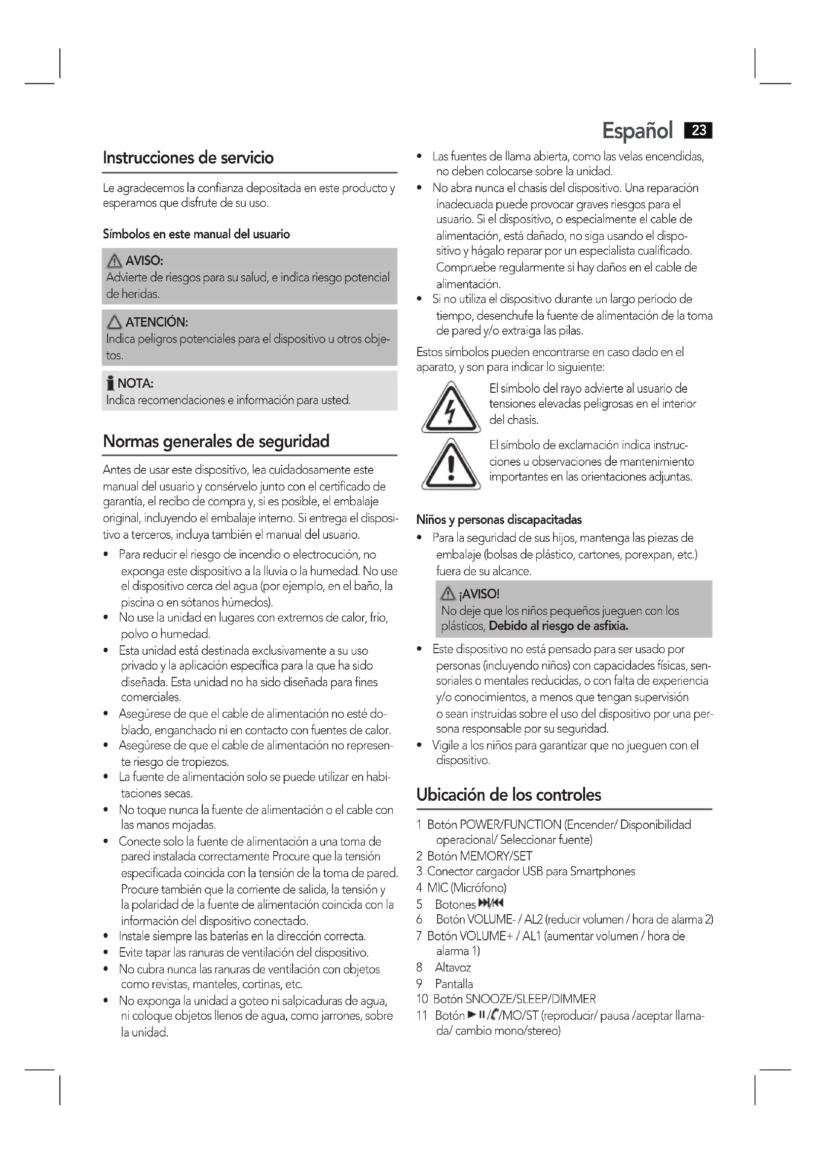 - Sinoutilizaeldispositivoduranteunlargoperíodode tiempo, desenchufe la fuente de alimentación de la toma deparedy/oextraigalaspilas. Estos símbolos pueden encontrarse en caso dado en el aparato, y son para indicar lo siguiente: El símbolo del rayo advierte al usuario de tensiones elevadas peligrosas en el interior del chasis. Elsímbolodeexclamaciónindicainstruc- ciones u observaciones de mantenimiento importantes en las orientaciones adjuntas. Niños y personas discapacitadas