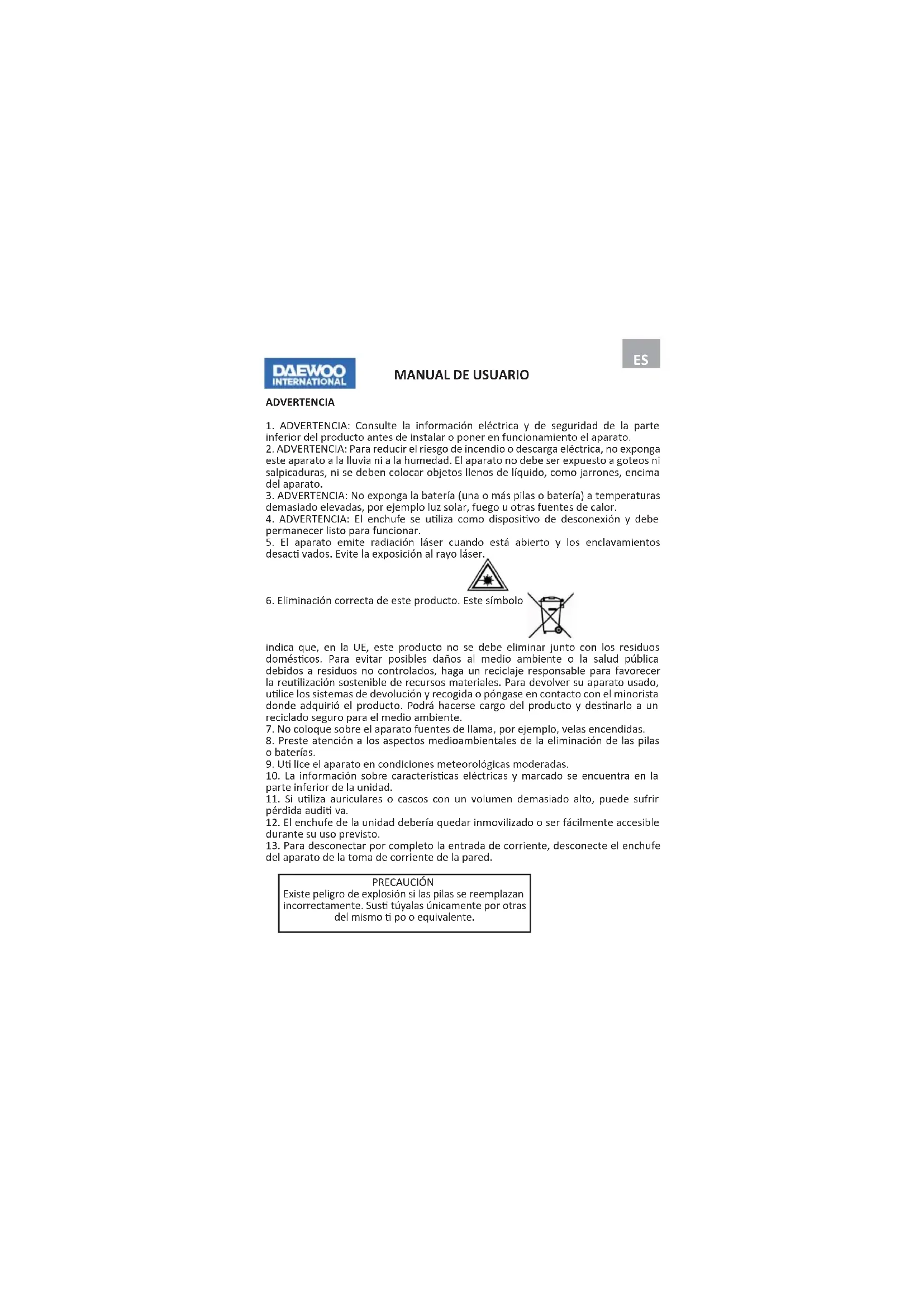 PRECAUCIÓN Existe peligro de explosión si las pilas se reemplazan incorrectamente. Sus túyalas únicamente por otras del mismo po o equivalente.ADVERTENCIA PARA EVITAR EL RIESGO DE INCENDIO O DESCARGA ELÉCTRICA, NO EXPONGA ESTE APARATO A LA LLUVIA NI A LA HUMEDAD. La e queta siguiente, fi jada en la unidad, enumera el procedimiento correcto para trabajar con el rayo láser: