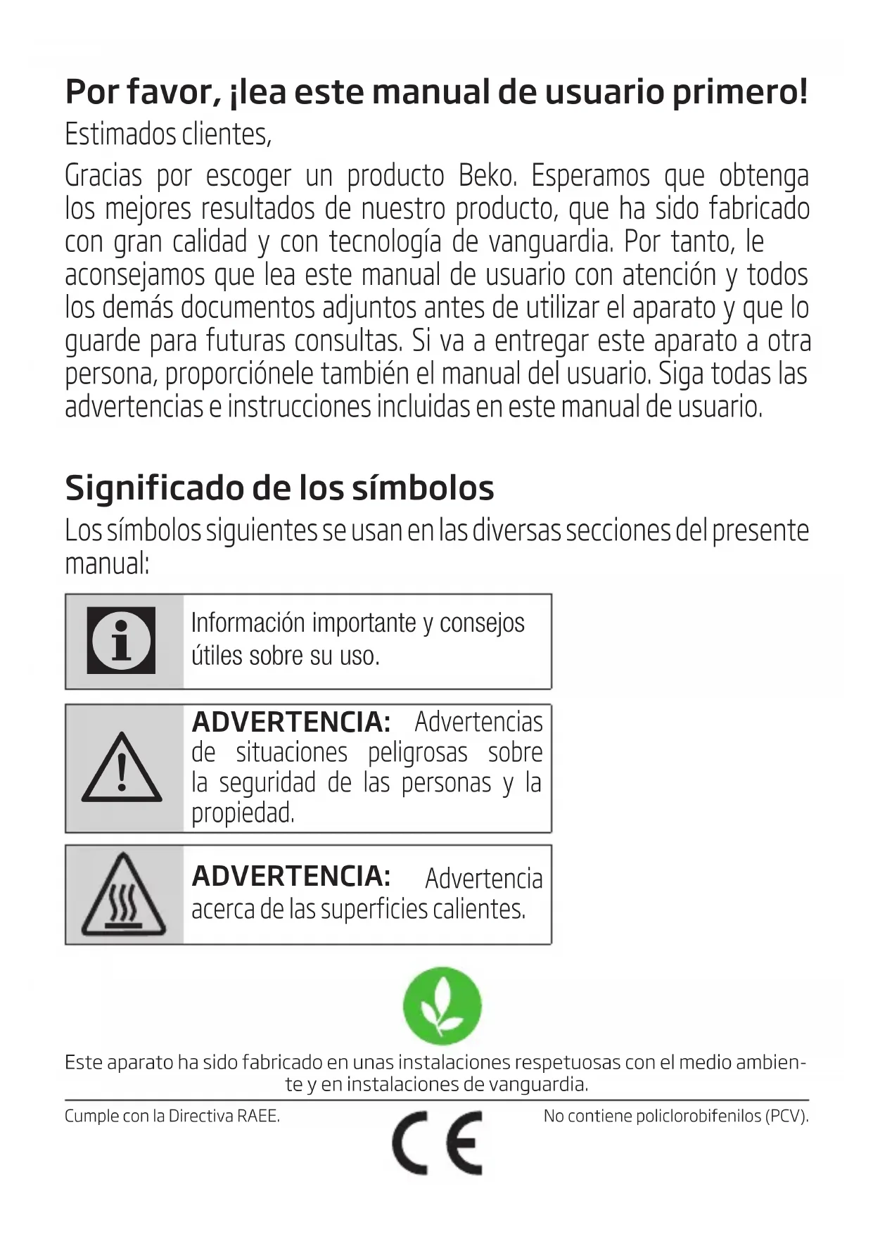 ADVERTENCIA: Advertencias de situaciones peligrosas sobre la seguridad de las personas y la propiedad. ADVERTENCIA: Advertencia acerca de las superficies calientes. No contiene policlorobifenilos (PCV).Este aparato ha sido fabricado en unas instalaciones respetuosas con el medio ambien-te y en instalaciones de vanguardia.Cumple con la Directiva RAEE.70 / ES Plancha al vapor / Manual de usuario Esta sección contiene instrucciones de segu- ridad que ayudarán a la protección contra los riesgos de lesiones personales o daño a la pro- piedad. El incumplimiento de estas instrucciones cau- sará la pérdida de la garantía.
