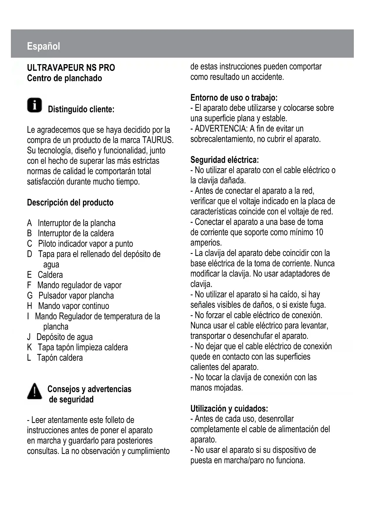 Centro de planchado Distinguido cliente: Le agradecemos que se haya decidido por la compra de un producto de la marca TAURUS. Su tecnología, diseño y funcionalidad, junto con el hecho de superar las más estrictas normas de calidad le comportarán total satisfacción durante mucho tiempo. Descripción del producto A Interruptor de la plancha B Interruptor de la caldera C Piloto indicador vapor a punto D Tapa para el rellenado del depósito de agua E Caldera F Mando regulador de vapor G Pulsador vapor plancha H Mando vapor continuo I Mando Regulador de temperatura de la plancha J Depósito de agua K Tapa tapón limpieza caldera L Tapón caldera
