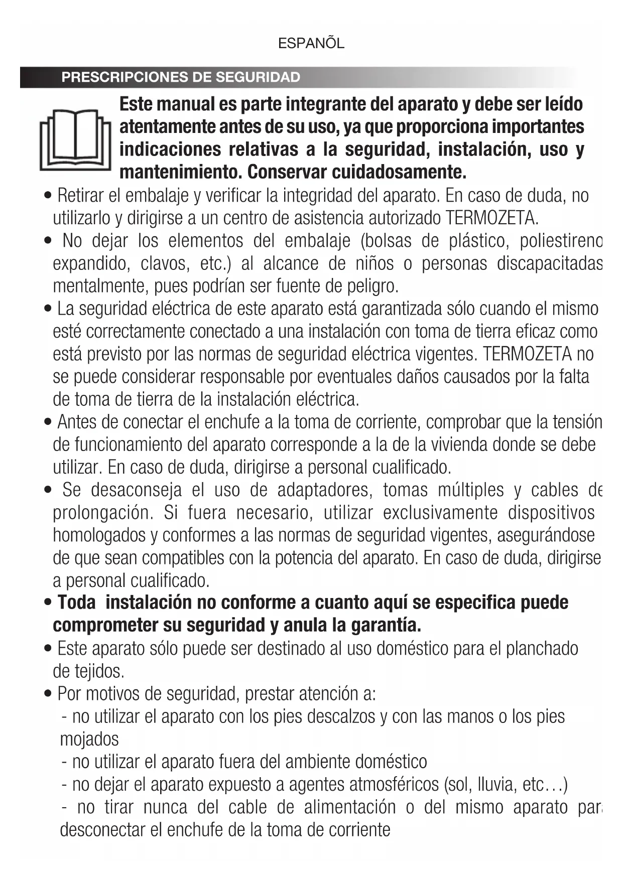 - No sustituir el cable de alimentación del aparato. Si fuera necesario, dirigirse a un centro de asistencia autorizado TERMOZETA o a personal cualicado.