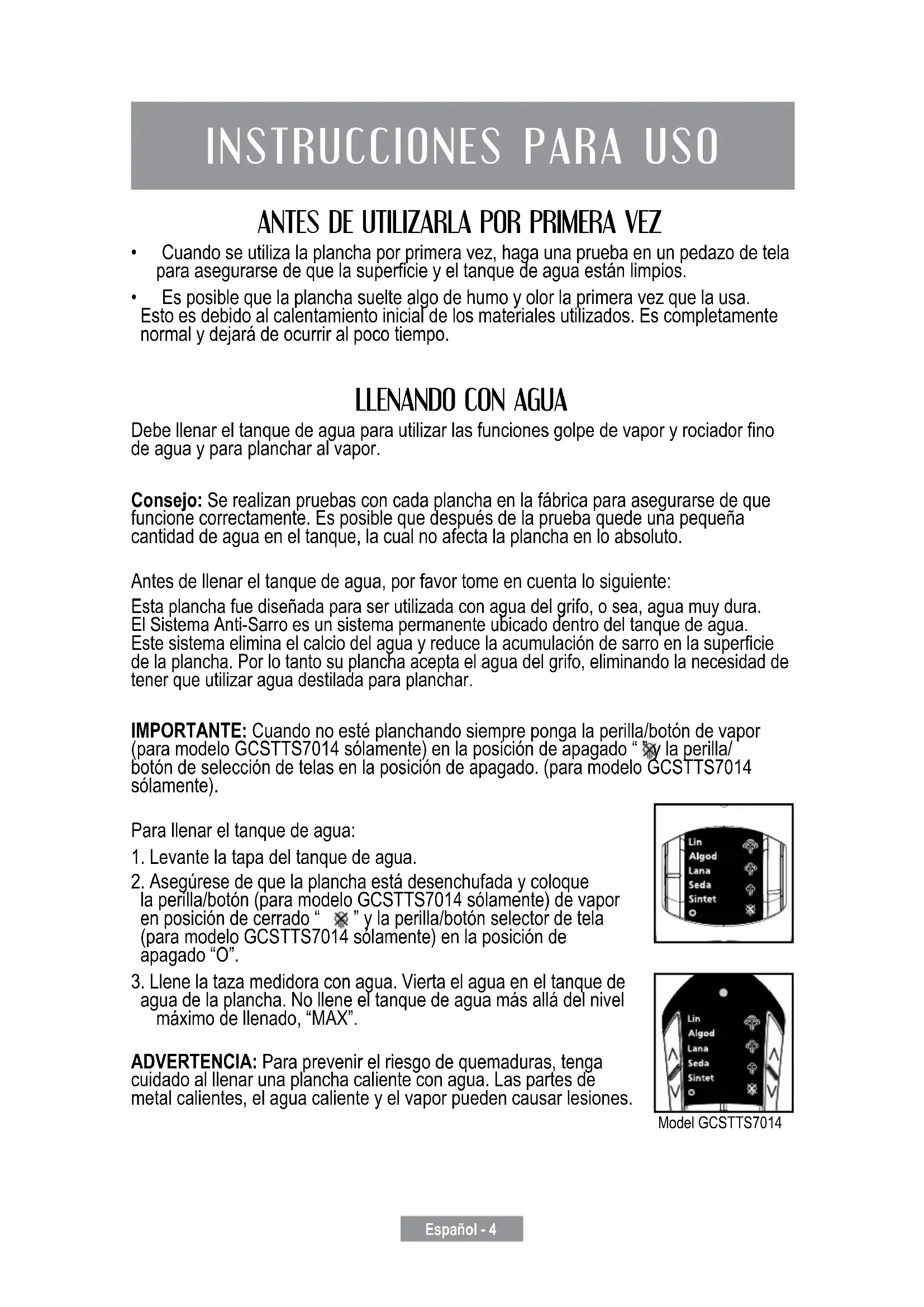 Debellenareltanquedeaguaparautilizarlasfuncionesgolpedevaporyrociadorno de agua y para planchar al vapor. Consejo: Se realizan pruebas con cada plancha en la fábrica para asegurarse de que funcione correctamente. Es posible que después de la prueba quede una pequeña cantidad de agua en el tanque, la cual no afecta la plancha en lo absoluto. Antes de llenar el tanque de agua, por favor tome en cuenta lo siguiente: Esta plancha fue diseñada para ser utilizada con agua del grifo, o sea, agua muy dura. El Sistema Anti-Sarro es un sistema permanente ubicado dentro del tanque de agua. Estesistemaeliminaelcalciodelaguayreducelaacumulacióndesarroenlasupercie de la plancha. Por lo tanto su plancha acepta el agua del grifo, eliminando la necesidad de tener que utilizar agua destilada para planchar. IMPORTANTE: Cuando no esté planchando siempre ponga la perilla/botón de vapor (para modelo GCSTTS7014 sólamente) en la posición de apagado “ ” y la perilla/ botón de selección de telas en la posición de apagado. (para modelo GCSTTS7014 sólamente). Para llenar el tanque de agua: