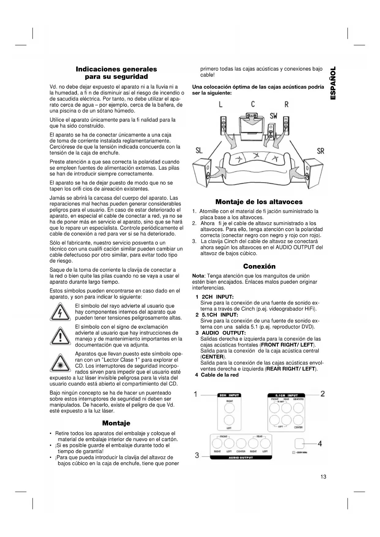1 2CH INPUT RIGHT LEFT 5.1CH INPUT FRONT REAR 18-WOOFER R/BRT LEFT CENTER 3 FRONT REAR RIGHT LEFT CENTER RIGHT LEFT AUDIO OUTPUT -220V MHz 4El cableado correcto se presenta de siguiente manera :