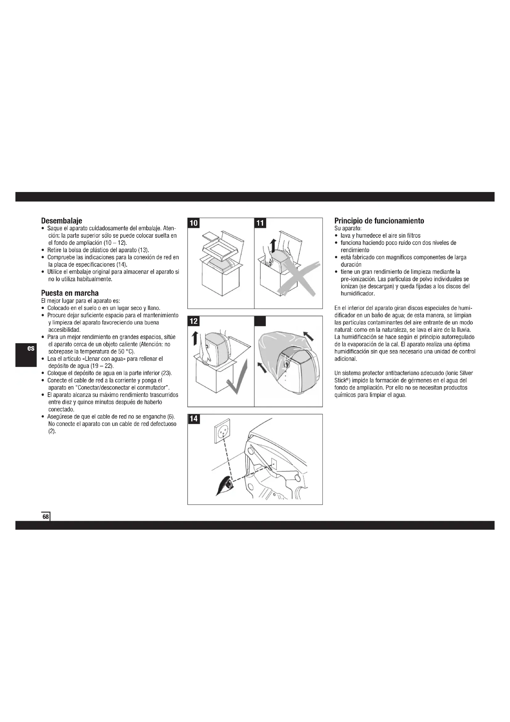 - Para la limpieza del aire utilice el contenedor de polvo destinado a tal fin (consulte también el artículo “Utilizar fragancias”). No ponga aditivos como aceites esenciales en contacto directo con el depósito de agua o con el fondo de agua. ¡Estos aditivos dañan su apa- rato! Los daños causados por estos productos están excluidos de la garantía. 07-2055-2055D-EU-Manual-ES.indd 66 18.7.2006 18:36:46 Uhr67