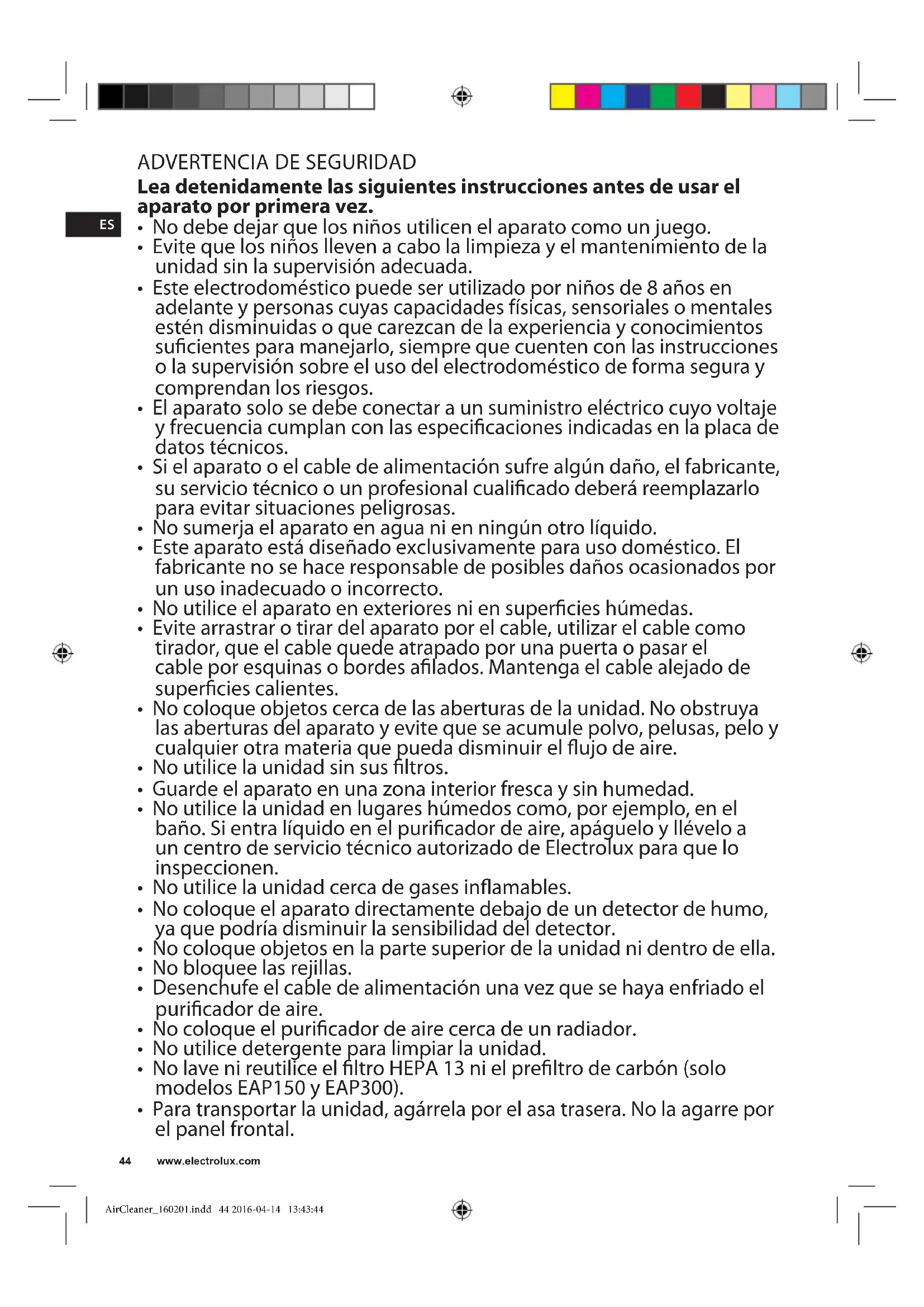 - No utilice la unidad en lugares húmedos como, por ejemplo, en el baño. Si entra líquido en el puricador de aire, apáguelo y llévelo a un centro de servicio técnico autorizado de Electrolux para que lo inspeccionen.