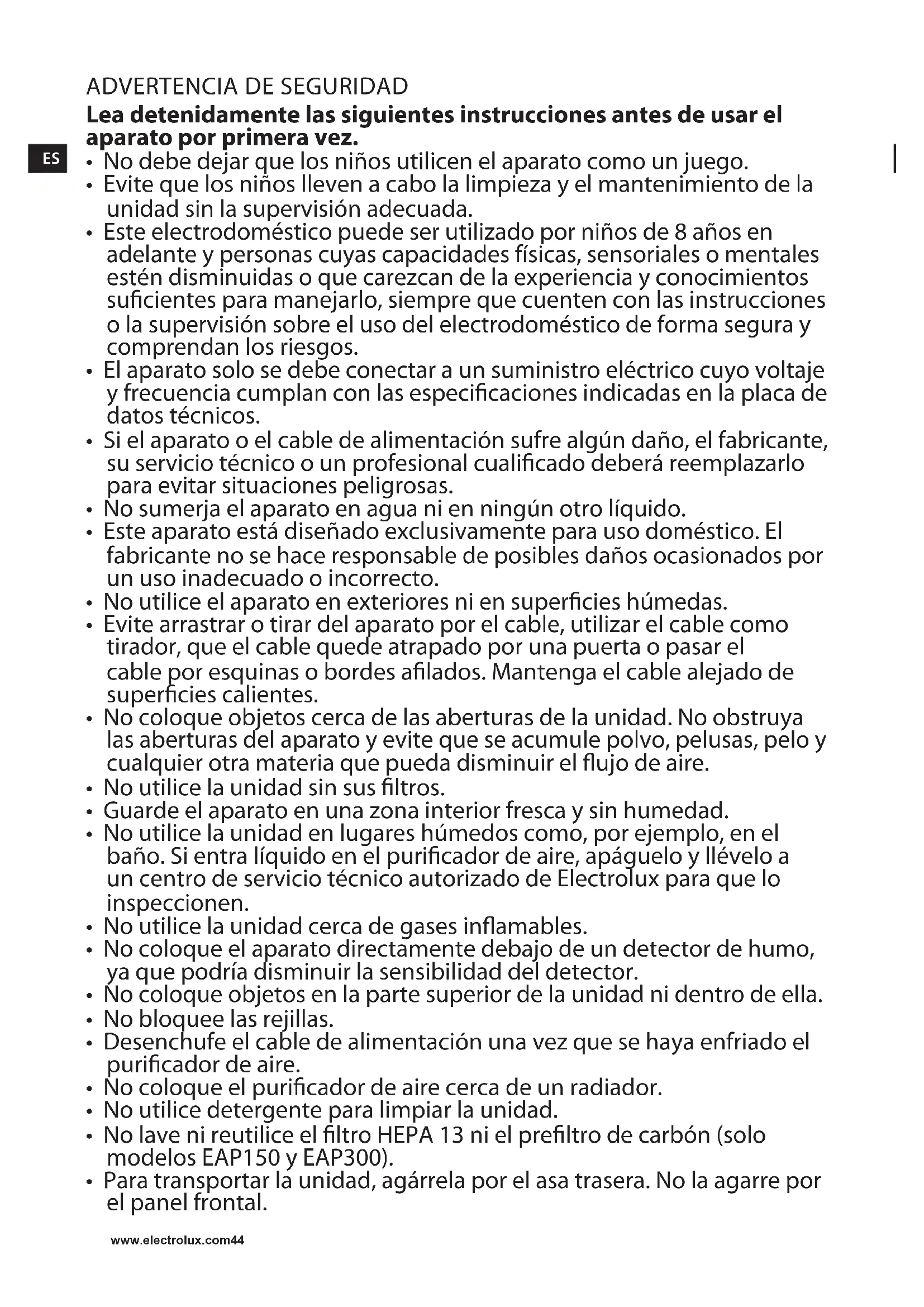 EAP150, EAP300, EAP450Caso Posible causa/solución¿Puedo lavar el ltro? No, los ltros que incorpora la unidad podrían romperse y estropearse si les entra agua. (Los ltros del modelo EAP450 pueden lavarse)¿Puedo aspirar mi ltro? No, la aspiración volverá a esparcir el polvo al aire. Si cree que el ltro está demasiado sucio, puede que deba sustituirlo. (El preltro lavable del modelo EAP450 puede limpiarse con una aspiradora o un cepillo suave) Acabo de abrir la unidad y huele mal. La unidad va envuelta rmemente en un paquete de plástico y cartón ondulado. Puesto que incorpora un ventilador y expulsa aire a través de él, es posible que emita olores "a nuevo". Dependiendo de la sensibilidad, los olores deberían desaparecer en unos días o quizá en una semana, en función del uso.¿Limpiará la unidad un área de mayor tamaño al especicado?Los valores de la tasa de emisión de aire puro (CADR, Clean Air Delivery Rate) se aplican un entorno de prueba controlado. Si ese entorno cambia, el funcionamiento de la unidad podría verse afectado. No obstante, si su habitación es un poco más grande que el especicado por el valor CADR, la unidad seguirá puricando el aire, pero podría tardar más tiempo en hacerlo. Dónde debo colocar la unidad? Coloque la unidad de forma que el aire pueda circular sin problema por los laterales y por la parte frontal. Si hay puertas o pasillos estrechos, el ujo de aire que pasa al puricador podría verse reducido, pero acabará circulando cerca del aparato.La luz AIR QUALITY de calidad del aire es naranja o roja, pero el aire parece estar limpio.Limpie el sensor con una aspiradora, ya que podría estar bloqueado o atascado.En ocasiones, un recipiente de aire comprimido puede ayudar a desatascar la suciedad del sensor.Aún percibo polvo en el aire o en los muebles.La unidad recogerá la mayor parte del polvo y las partículas; sin embargo, si hay puertas o ventanas abiertas, o si dispone de climatización central, es posible que siga viendo algo de polvo. No hay nada que je los ltros en su lugar. Los ltros están diseñados para caber en la unidad. Una vez que encienda la unidad, la fuerza del aire que expulsa el aparato sellará con rmeza los ltros.Puedo oír las revoluciones del motor del ventilador.Esto algo totalmente normal, especialmente por la noche, cuando no se oyen ruidos externos.La unidad ya no elimina los olores de manera ecaz o parece emitir algún tipo de olor.Asegúrese de que no haya nada que obstruya el sensor de calidad del aire o que no esté atascado.Acerque la unidad al lugar del que se desprenden los malos olores.Sustituya los ltros; es posible que hayan alcanzado la capacidad que tienen para absorber los agentes contaminantes. Es posible que deba sustituir los ltros más a menudo.El indicador CHECK FILTER de comprobación del ltro permanece encendido tras reemplazar el ltro HEPA.Pulse el botón RESET FILTER introduciendo con cuidado un clip en el oricio del botón RESET FILTER. Manténgalo pulsado durante 3-5 segundos hasta escuchar el pitido que indica que se ha restablecido la unidad.www.electrolux.com48■ ■ ■ EAP300, EAP450Caso Posible causa/solución ¿Puedo desactivar el modo nocturno? No. Sin embargo, puede cambiar manualmente a la velocidad del ventilador que quiera. La velocidad se mantendrá hasta que la vuelva a cambiar. La unidad emite un sonido "de tic". Ese sonido lo emite la tecnología PlasmaWave™ y puede aparecer y desaparecer dependiendo del entorno. No obstante, siempre que la luz de PlasmaWave™ esté encendida, signicará que está funcionando. El mando a distancia no funciona. Asegúrese de que las pilas del mando a distancia están colocadas correctamente. Sustituya las pilas desgastadas.Asegúrese de que entre el mando a distancia y el puricador de aire haya una línea de visión clara. ■ ■ ■ EAP450Caso Posible causa/soluciónLa luz de calidad del aire está de color blanco, pero todavía hay polvo en el aire o se perciben olores.Asegúrese de que no haya nada que obstruya el sensor y de que no esté atascado.Cambie el ltro.Parece que la unidad emite olores. Acerque la unidad al lugar del que se desprenden los malos olores.Cambie el ltro.Aún percibo polvo en el aire o en los muebles.La unidad recogerá la mayor parte del polvo y las partículas; sin embargo, si hay puertas o ventanas abiertas, o si dispone de climatización central, es posible que siga viendo algo de polvo.La unidad funciona al máximo rendimiento todo el tiempo.Limpie el sensor con una aspiradora, ya que podría estar bloqueado o atascado.En ocasiones, un recipiente de aire comprimido puede ayudar a desatascar la suciedad del sensor.El indicador CHECK FILTER de comprobación del ltro permanece encendido tras reemplazar el cartucho de ltro.Pulse el botón RESET FILTER introduciendo con cuidado un clip en el oricio del botón RESET FILTER. Manténgalo pulsado durante 3-5 segundos hasta escuchar el pitido que indica que se ha restablecido la unidad.