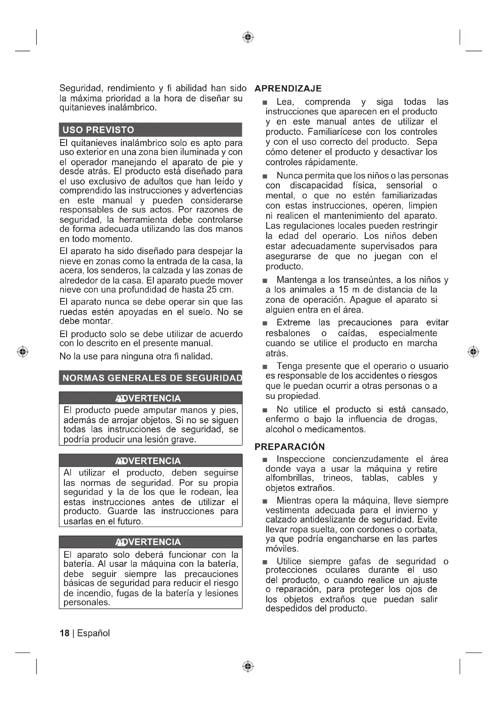 ADVERTENCIA El producto puede amputar manos y pies, además de arrojar objetos. Si no se siguen todas las instrucciones de seguridad, se podría producir una lesión grave. ADVERTENCIA Al utilizar el producto, deben seguirse las normas de seguridad. Por su propia seguridad y la de los que le rodean, lea estas instrucciones antes de utilizar el producto. Guarde las instrucciones para usarlas en el futuro. ADVERTENCIA El aparato solo deberá funcionar con la batería. Al usar la máquina con la batería, debe seguir siempre las precauciones básicas de seguridad para reducir el riesgo de incendio, fugas de la batería y lesiones personales. APRENDIZAJE ■ Lea, comprenda y siga todas las instrucciones que aparecen en el producto y en este manual antes de utilizar el producto. Familiarícese con los controles y con el uso correcto del producto. Sepa cómo detener el producto y desactivar los controles rápidamente. ■ Nunca permita que los niños o las personas con discapacidad física, sensorial o mental, o que no estén familiarizadas con estas instrucciones, operen, limpien ni realicen el mantenimiento del aparato. Las regulaciones locales pueden restringir la edad del operario. Los niños deben estar adecuadamente supervisados para asegurarse de que no juegan con el producto. ■ Mantenga a los transeúntes, a los niños y a los animales a 15 m de distancia de la zona de operación. Apague el aparato si alguien entra en el área. ■ Extreme las precauciones para evitar resbalones o caídas, especialmente cuando se utilice el producto en marcha atrás. ■ Tenga presente que el operario o usuario es responsable de los accidentes o riesgos que le puedan ocurrir a otras personas o a su propiedad. ■ No utilice el producto si está cansado, enfermo o bajo la influencia de drogas, alcohol o medicamentos. PREPARACIÓN ■ Inspeccione concienzudamente el área donde vaya a usar la máquina y retire alfombrillas, trineos, tablas, cables y objetos extraños. ■ Mientras opera la máquina, lleve siempre vestimenta adecuada para el invierno y calzado antideslizante de seguridad. Evite llevar ropa suelta, con cordones o corbata, ya que podría engancharse en las partes móviles. ■ Utilice siempre gafas de seguridad o protecciones oculares durante el uso del producto, o cuando realice un ajuste o reparación, para proteger los ojos de los objetos extraños que puedan salir despedidos del producto.19 Español |