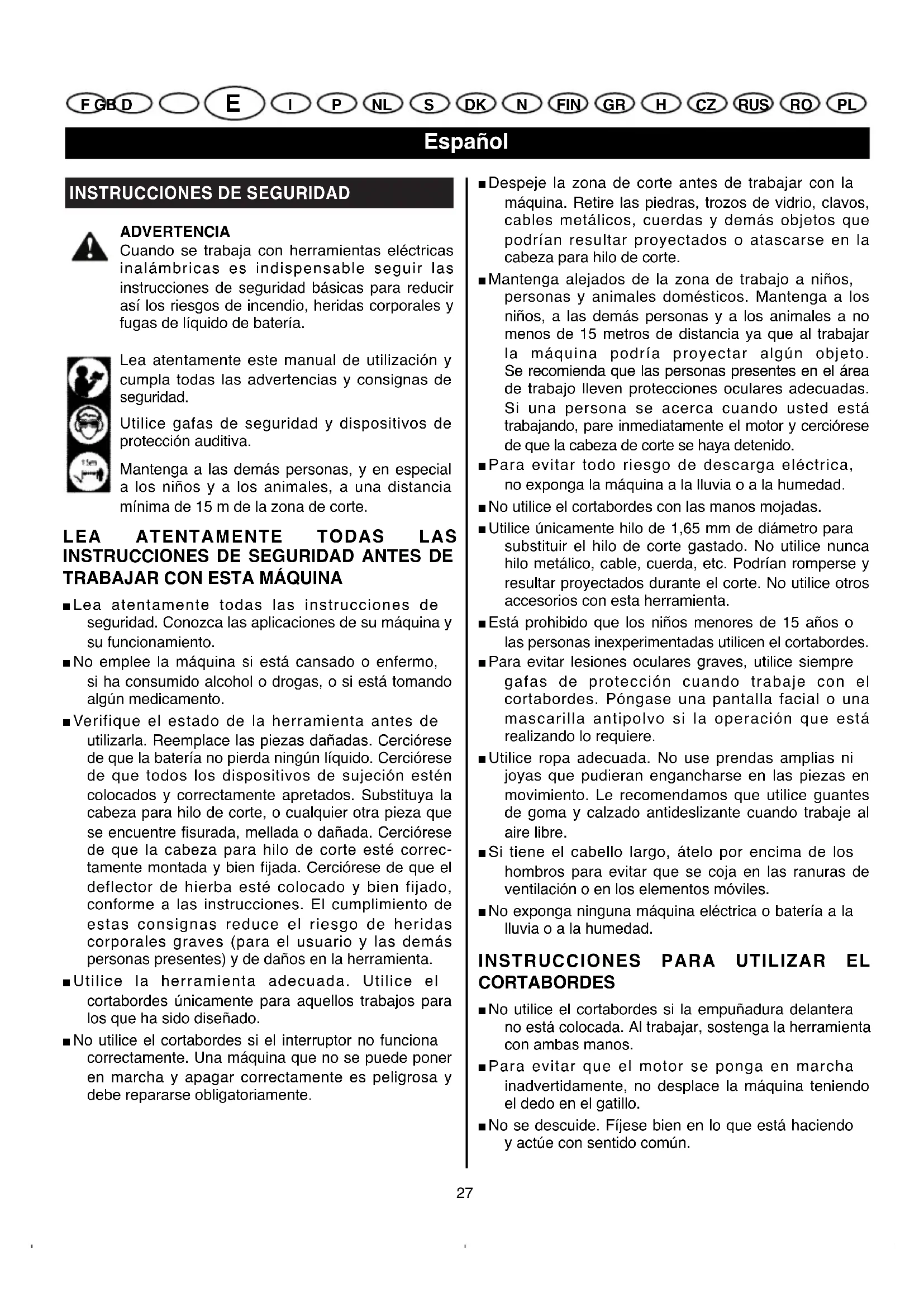 F GB E Deutsch I P NL S DK N FIN GR H CZ RUS RO PL CLT-1423P / 1823 P manual 24/11/04 11:57 Page 26INSTRUCCIONES DE SEGURIDAD ADVERTENCIA Cuando se trabaja con herramientas eléctricas inalámbricas es indispensable seguir las instrucciones de seguridad básicas para reducir así los riesgos de incendio, heridas corporales y fugas de líquido de batería. Lea atentamente este manual de utilización y cumpla todas las advertencias y consignas de seguridad. Utilice gafas de seguridad y dispositivos de protección auditiva. Mantenga a las demás personas, y en especial a los niños y a los animales, a una distancia mínima de 15 m de la zona de corte.