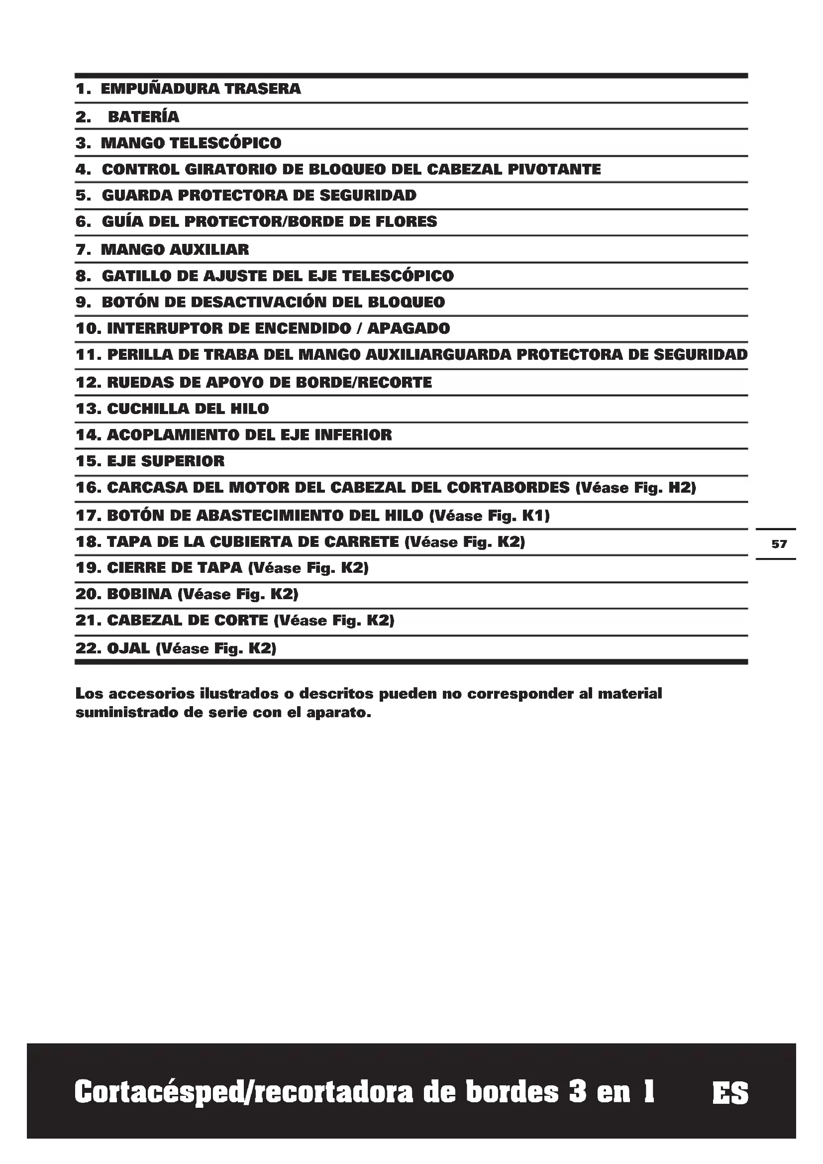 Los accesorios ilustrados o descritos pueden no corresponder al material suministrado de serie con el aparato. Cortacésped/recortadora de bordes 3 en 1 ES5958 Cortacésped/recortadora de bordes 3 en 1