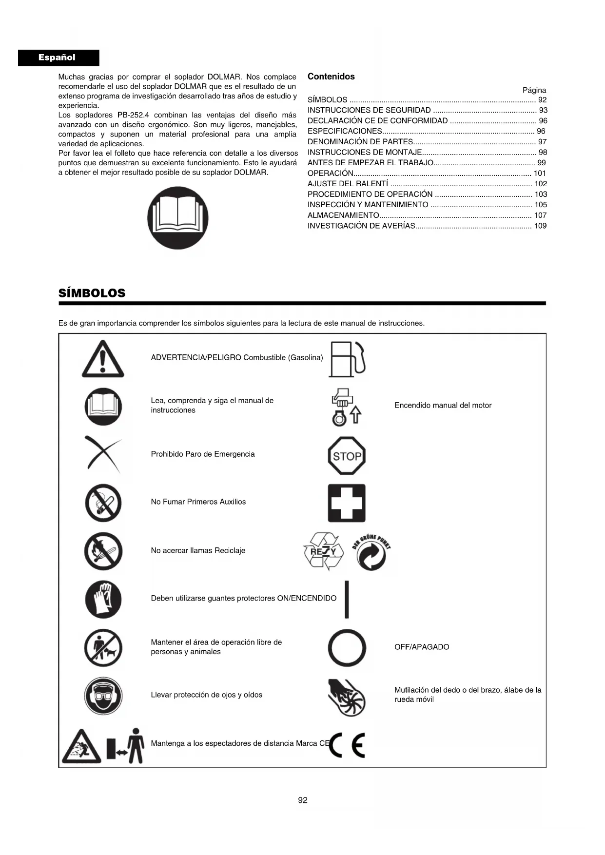 (P92~P109) Importante: Lea bien este manual antes de poner el soplador en funcionamiento, y observe estricta- mente las medidas de seguridad. Conserve este manual de instrucciones.