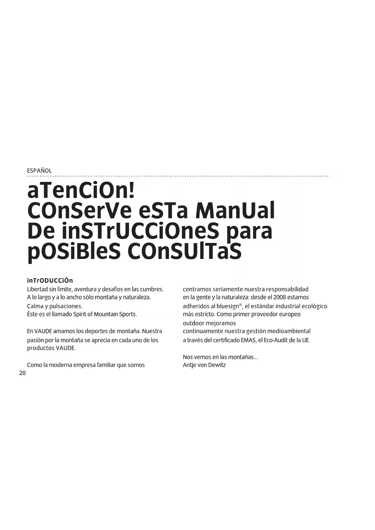 - Non tendere i tiranti nelle zone di passaggio perché al buio vi si potrebbe inciampare.28 ESPAÑOL aTenCiOn! COnSerVe eSTa ManUal De inSTrUCCiOneS para pOSiBleS COnSUlTaS inTrODUCCión Libertad sin límite, aventura y desafíos en las cumbres. A lo largo y a lo ancho sólo montaña y naturaleza. Calma y pulsaciones. Éste es el llamado Spirit of Mountain Sports. En VAUDE amamos los deportes de montaña. Nuestra pasión por la montaña se aprecia en cada uno de los productos VAUDE. Como la moderna empresa familiar que somos centramos seriamente nuestra responsabilidad en la gente y la naturaleza: desde el 2008 estamos adheridos al bluesign®, el estándar industrial ecológico más estricto. Como primer proveedor europeo outdoor mejoramos continuamente nuestra gestión medioambiental a través del certificado EMAS, el Eco-Audit de la UE. Nos vemos en las montañas... Antje von Dewitz29 ESPAÑOL eleCCión Del TerrenO: