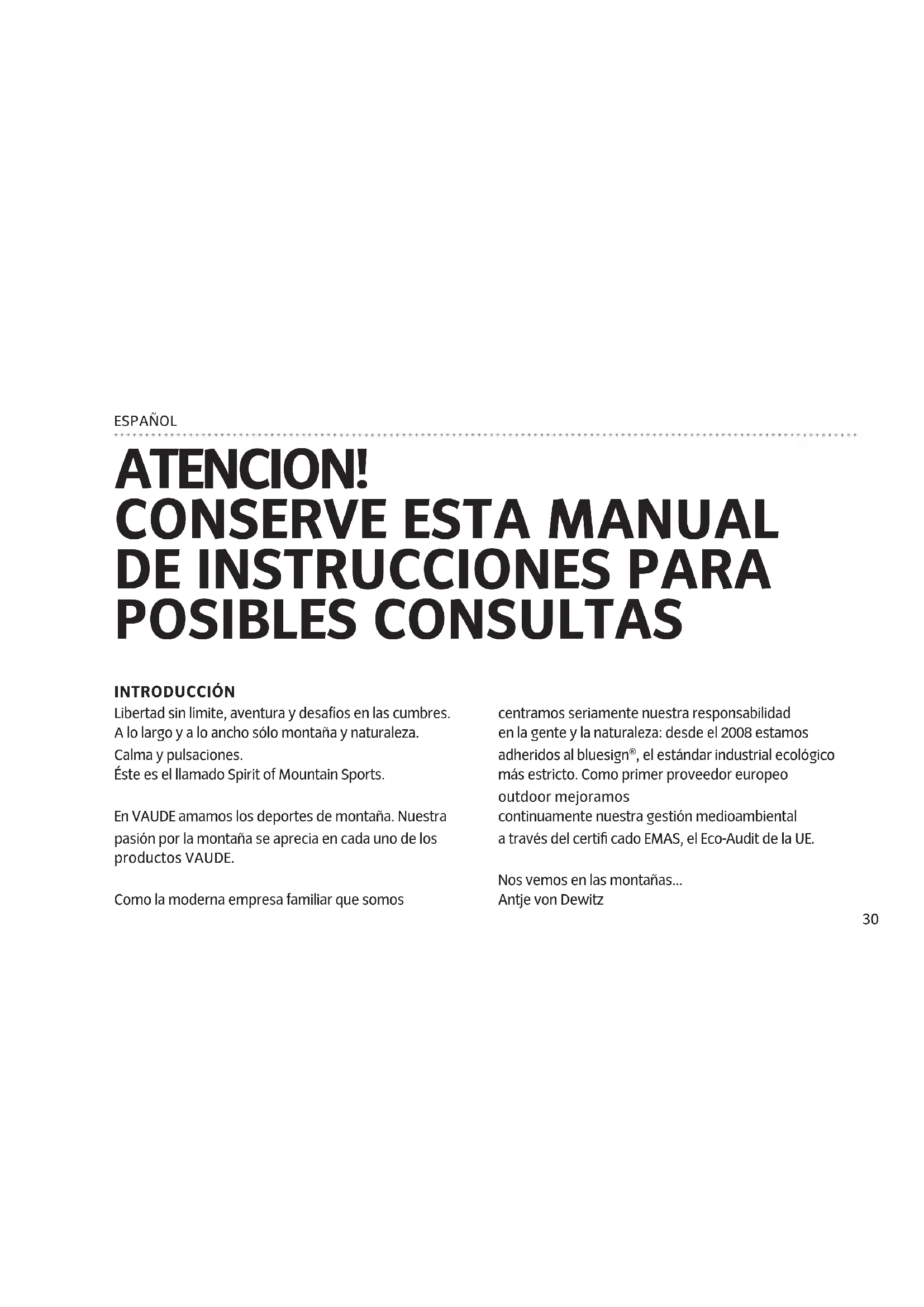 POSIBLES CONSULTAS INTRODUCCIÓN Libertad sin límite, aventura y desafíos en las cumbres. A lo largo y a lo ancho sólo montaña y naturaleza. Calma y pulsaciones. Éste es el llamado Spirit of Mountain Sports. En VAUDE amamos los deportes de montaña. Nuestra pasión por la montaña se aprecia en cada uno de los productos VAUDE. Como la moderna empresa familiar que somos centramos seriamente nuestra responsabilidad en la gente y la naturaleza: desde el 2008 estamos adheridos al bluesign®, el estándar industrial ecológico más estricto. Como primer proveedor europeo outdoor mejoramos continuamente nuestra gestión medioambiental a través del certifi cado EMAS, el Eco-Audit de la UE. Nos vemos en las montañas... Antje von Dewitz ESPAÑOL31 ESPAÑOL ELECCIÓN DEL TERRENO: