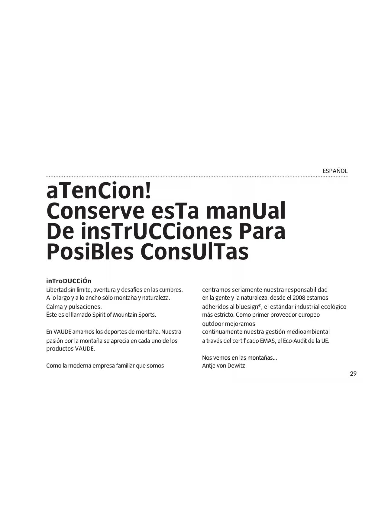 - Non tendere i tiranti nelle zone di passaggio perché al buio vi si potrebbe inciampare.29 ESPAÑOL aTenCion! Conserve esTa manUal De insTrUCCiones Para PosiBles ConsUlTas inTroDUCCión Libertad sin límite, aventura y desafíos en las cumbres. A lo largo y a lo ancho sólo montaña y naturaleza. Calma y pulsaciones. Éste es el llamado Spirit of Mountain Sports. En VAUDE amamos los deportes de montaña. Nuestra pasión por la montaña se aprecia en cada uno de los productos VAUDE. Como la moderna empresa familiar que somos centramos seriamente nuestra responsabilidad en la gente y la naturaleza: desde el 2008 estamos adheridos al bluesign®, el estándar industrial ecológico más estricto. Como primer proveedor europeo outdoor mejoramos continuamente nuestra gestión medioambiental a través del certificado EMAS, el Eco-Audit de la UE. Nos vemos en las montañas... Antje von Dewitz30 ESPAÑOL eleCCión Del Terreno: