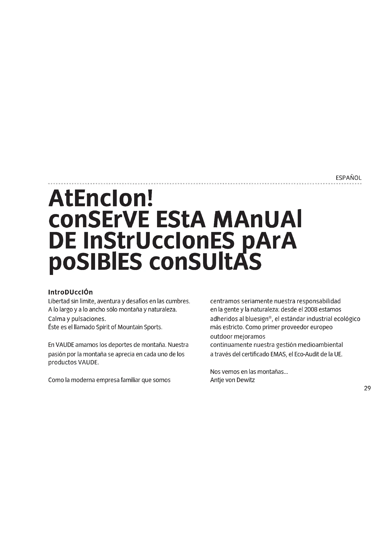 - Non tendere i tiranti nelle zone di passaggio perché al buio vi si potrebbe inciampare.29 ESPAÑOL AtEncIon! conSErVE EStA MAnUAl DE InStrUccIonES pArA poSIBlES conSUltAS IntroDUccIón Libertad sin límite, aventura y desafíos en las cumbres. A lo largo y a lo ancho sólo montaña y naturaleza. Calma y pulsaciones. Éste es el llamado Spirit of Mountain Sports. En VAUDE amamos los deportes de montaña. Nuestra pasión por la montaña se aprecia en cada uno de los productos VAUDE. Como la moderna empresa familiar que somos centramos seriamente nuestra responsabilidad en la gente y la naturaleza: desde el 2008 estamos adheridos al bluesign®, el estándar industrial ecológico más estricto. Como primer proveedor europeo outdoor mejoramos continuamente nuestra gestión medioambiental a través del certificado EMAS, el Eco-Audit de la UE. Nos vemos en las montañas... Antje von Dewitz30 ESPAÑOL ElEccIón DEl tErrEno: