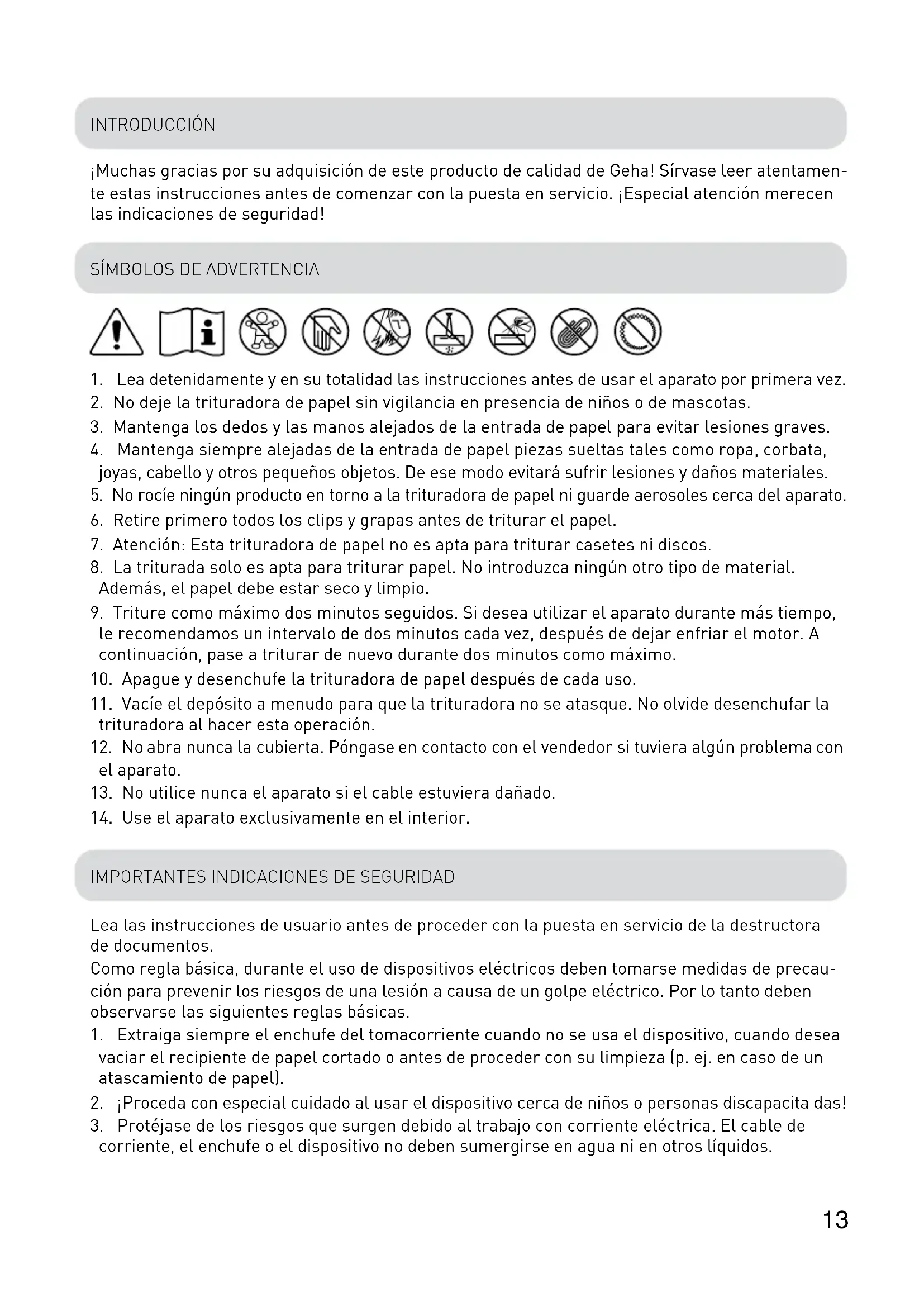 ¡Muchas gracias por su adquisición de este producto de calidad de Geha! Sírvase leer atentamen- te estas instrucciones antes de comenzar con la puesta en servicio. ¡Especial atención merecen las indicaciones de seguridad! Lea las instrucciones de usuario antes de proceder con la puesta en servicio de la destructora de documentos. Como regla básica, durante el uso de dispositivos eléctricos deben tomarse medidas de precau- ción para prevenir los riesgos de una lesión a causa de un golpe eléctrico. Por lo tanto deben observarse las siguientes reglas básicas.