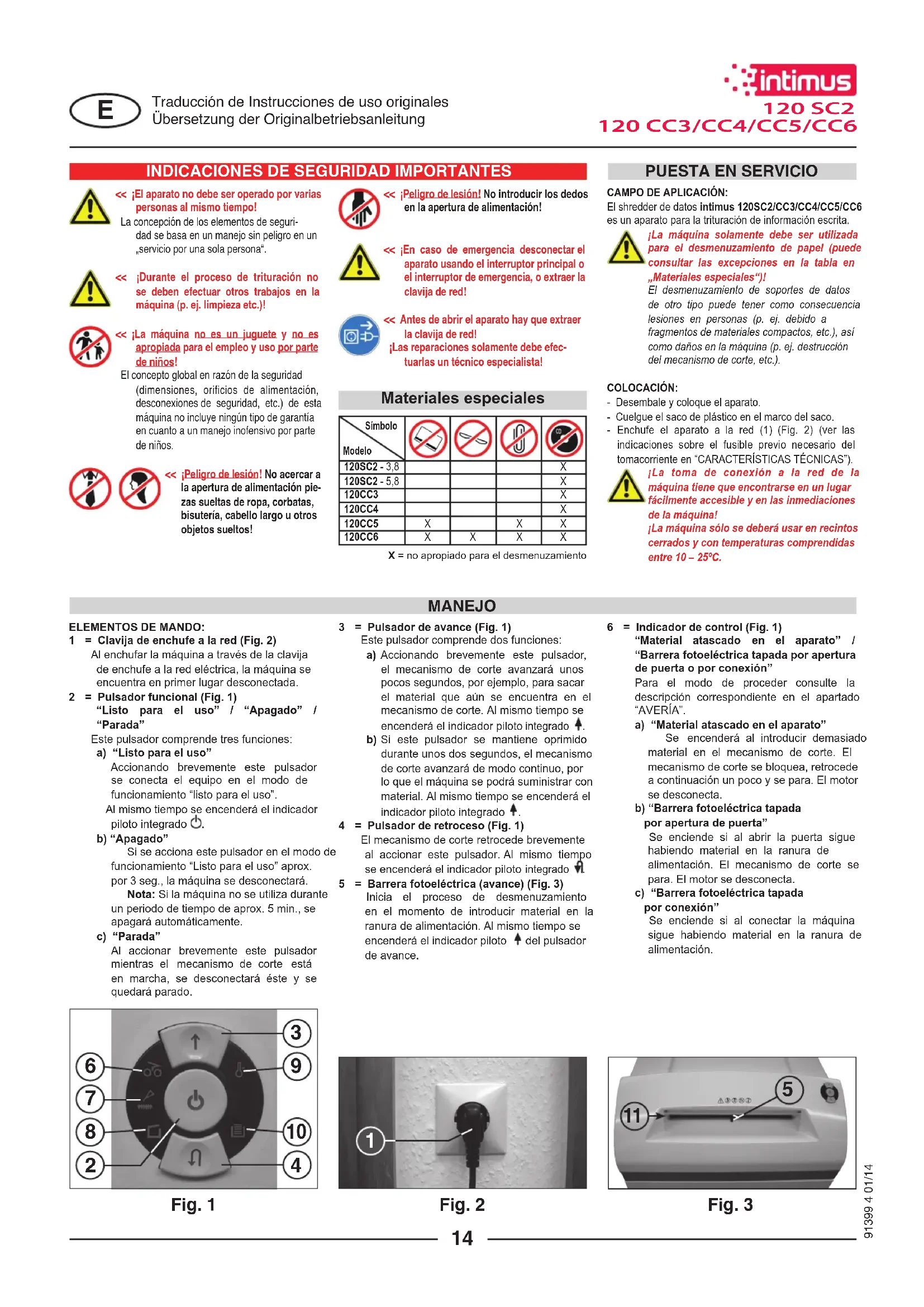 ELEMENTOS DE MANDO:1 = Clavija de enchufe a la red (Fig. 2) Al enchufar la máquina a través de la clavija de enchufe a la red eléctrica, la máquina se encuentra en primer lugar desconectada.2 = Pulsador funcional (Fig. 1) “Listo para el uso” / “Apagado” / “Parada” Este pulsador comprende tres funciones: a) “Listo para el uso” Accionando brevemente este pulsador se conecta el equipo en el modo de funcionamiento “listo para el uso”. Al mismo tiempo se encenderá el indicador piloto integrado b) “Apagado” Si se acciona este pulsador en el modo de funcionamiento “Listo para el uso” aprox. por 3 seg., la máquina se desconectará. Nota: Si la máquina no se utiliza durante un periodo de tiempo de aprox. 5 min., se apagará automáticamente. c) “Parada” Al accionar brevemente este pulsador mientras el mecanismo de corte está en marcha, se desconectará éste y se quedará parado. 3 = Pulsador de avance (Fig. 1) Este pulsador comprende dos funciones: a) Accionando brevemente este pulsador, el mecanismo de corte avanzará unos pocos segundos, por ejemplo, para sacar el material que aún se encuentra en el mecanismo de corte. Al mismo tiempo se encenderá el indicador piloto integrado . b) Si este pulsador se mantiene oprimido durante unos dos segundos, el mecanismo de corte avanzará de modo continuo, por lo que el máquina se podrá suministrar con material. Al mismo tiempo se encenderá el indicador piloto integrado 4 = Pulsador de retroceso (Fig. 1) El mecanismo de corte retrocede brevemente al accionar este pulsador. Al mismo tiempo se encenderá el indicador piloto integrado .5 = Barrera fotoeléctrica (avance) (Fig. 3) Inicia el proceso de desmenuzamiento en el momento de introducir material en la ranura de alimentación. Al mismo tiempo se encenderá el indicador piloto del pulsador de avance.6 = Indicador de control (Fig. 1) “Material atascado en el aparato” / “Barrera fotoeléctrica tapada por apertura de puerta o por conexión” Para el modo de proceder consulte la descripción correspondiente en el apartado “AVERÍA”. a) “Material atascado en el aparato” Se encenderá al introducir demasiado material en el mecanismo de corte. El mecanismo de corte se bloquea, retrocede a continuación un poco y se para. El motor se desconecta. b) “Barrera fotoeléctrica tapada por apertura de puerta” Se enciende si al abrir la puerta sigue habiendo material en la ranura de alimentación. El mecanismo de corte se para. El motor se desconecta. c) “Barrera fotoeléctrica tapada por conexión” Se enciende si al conectar la máquina sigue habiendo material en la ranura de alimentación. Traducción de Instrucciones de uso originales Übersetzung der Originalbetriebsanleitung Materiales especiales SímboloModeloX = no apropiado para el desmenuzamiento120 SC2 120 CC3/CC4/CC5/CC6 La destructora no se debe utilizar nunca como asiento ni como taburete. ¡Peligro de caída por rotura de material!CÓMO CONECTAR EL APARATO:Para conectar el aparato en “listo para el uso” proceda como sigue:- Accione brevemente el pulsador funcional (2). - El indicador piloto del pulsador funcional (2) se encenderá para la función “Listo para el uso”. - A continuación se puede empezar a alimentar el aparato con papel.ALIMENTACIÓN DE MATERIAL:Introduzca papel por la ranura de alimentación de papel (11) (Fig. 3) al mecanismo de corte.El aparato se conecta automáticamente a la marcha de avance, mete el material y se desconecta automáticamente después de haber nalizado la etapa de desmenuzamiento.Notas: Para el desmenuzamiento de láminas transparentes se tiene que conectar la máquina a mano en el modo de funcionamiento de avance (mantenga accionado el pulsador de avance (3) durante unos 2 segundos).Accionando brevemente el pulsador funcional (2) (función de “Parada”) se puede detener en todo momento la etapa de desmenuzamiento. Para continuar, mantenga accionado el pulsador de avance (3) durante 2 segundos.Si la máquina no se utiliza durante un periodo de tiempo de aprox. 5 min. se desconecta. ¡No introduzca nunca en el aparato más material del indicado como máximo (consulte el apartado “DATOS TÉCNICOS”)!En el caso de que se haya introducido de todos modos demasiado material en el mecanismo de corte, consulte en “AVERÍAS” en el apartado “MATERIAL ATASCADO EN EL APARATO”.ELEMENTOS DE MANDO:7 = Indicador de control (Fig. 1) “Engrasar mecanismo de corte” Se enciende cuando el mecanismo de corte de la versión Cross-Cut (cruzado) se tiene que engrasar. El proceso de engrase se tiene que conrmar con el pulsador de retroceso (4) (ver descripción en “MANTENIMIENTO DEL MECANISMO DE CORTE”).8 = Indicador de control (Fig. 1) “Puerta abierta” / “Avería eléctrica” a) “Puerta abierta” Se enciende si la puerta del armario inferior está abierta. El aparato se desconecta automáticamente y no se puede conectar mientras la puerta siga estando abierta. b) “Avería eléctrica” parpadea, si ha surgido una avería eléctrica en los sensores de la puerta. El aparato se desconecta. Avise al comercio especializado más cercano.9 = Indicador de control (Fig. 1) “Sobrecarga de motor” / “Avería eléctrica” Para el modo de proceder consulte la descripción correspondiente en el apartado “AVERÍA”. a) “Guardamotor” Se enciende cuando el motor se ha sobrecargado y desconectado. La máquina no se puede activar durante la fase de enfriamiento del motor. b) “Avería eléctrica” parpadea, si ha surgido una avería eléctrica dentro de la placa de circuitos impresos del sistema de mando. Al mismo tiempo se encenderá el indicador piloto del pulsador funcional (2). La máquina se desconecta. Avise al comercio especializado más cercano.10 = Indicador de control (Fig. 1) “Saco recolector de papel lleno” Se enciende cuando el saco recolector para papel está lleno y se tiene que vaciar. El mecanismo de corte para el desmen