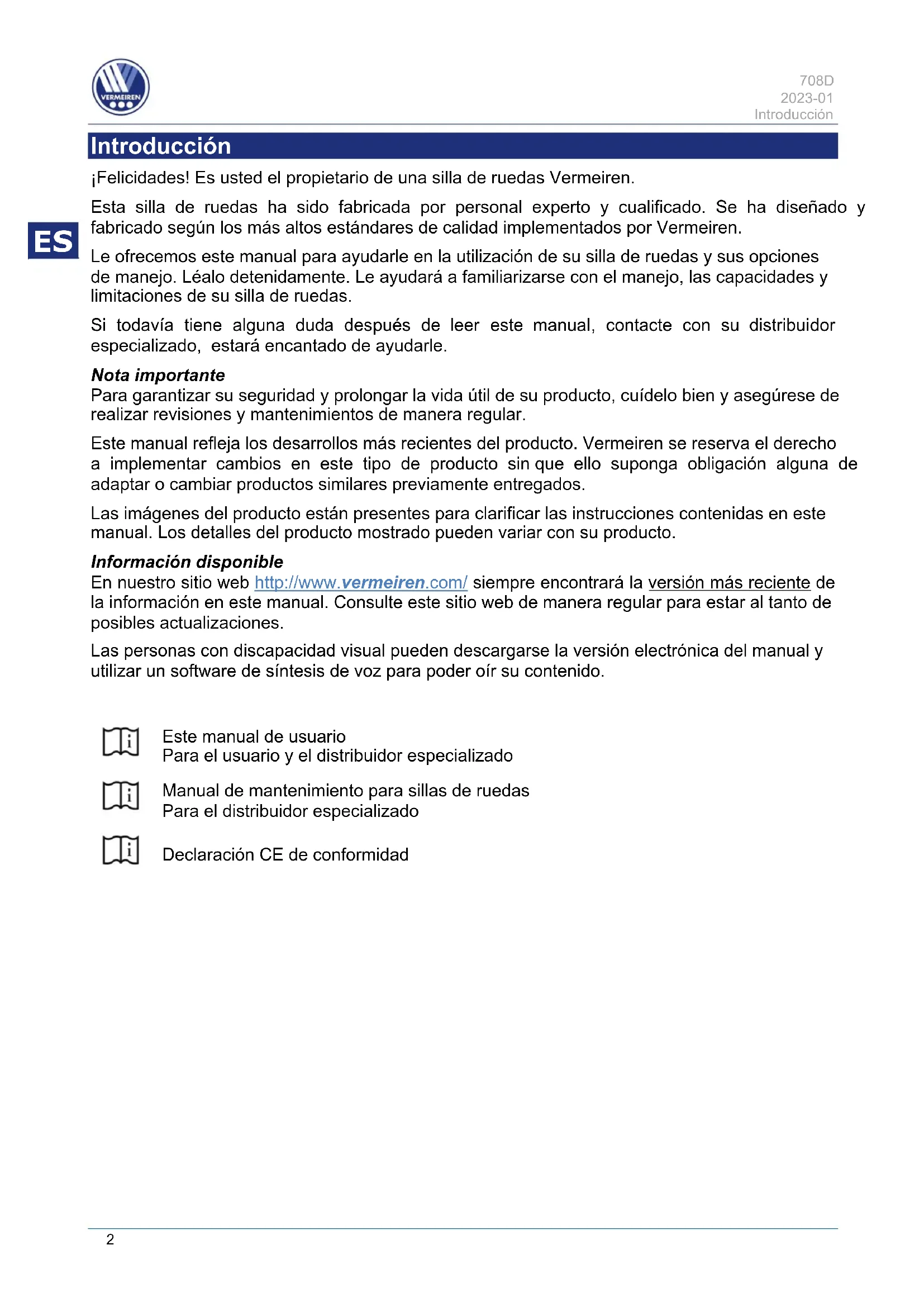 Introducción ¡Felicidades! Es usted el propietario de una silla de ruedas Vermeiren. Esta silla de ruedas ha sido fabricada por personal experto y cualificado. Se ha diseñado y fabricado según los más altos estándares de calidad implementados por Vermeiren. Le ofrecemos este manual para ayudarle en la utilización de su silla de ruedas y sus opciones de manejo. Léalo detenidamente. Le ayudará a familiarizarse con el manejo, las capacidades y limitaciones de su silla de ruedas. Si todavía tiene alguna duda después de leer este manual, contacte con su distribuidor especializado, estará encantado de ayudarle. Nota importante Para garantizar su seguridad y prolongar la vida útil de su producto, cuídelo bien y asegúrese de realizar revisiones y mantenimientos de manera regular. Este manual refleja los desarrollos más recientes del producto. Vermeiren se reserva el derecho a implementar cambios en este tipo de producto sin que ello suponga obligación alguna de adaptar o cambiar productos similares previamente entregados. Las imágenes del producto están presentes para clarificar las instrucciones contenidas en este manual. Los detalles del producto mostrado pueden variar con su producto. Información disponible En nuestro sitio web http://www.vermeiren.com/ siempre encontrará la versión más reciente de la información en este manual. Consulte este sitio web de manera regular para estar al tanto de posibles actualizaciones. Las personas con discapacidad visual pueden descargarse la versión electrónica del manual y utilizar un software de síntesis de voz para poder oír su contenido.