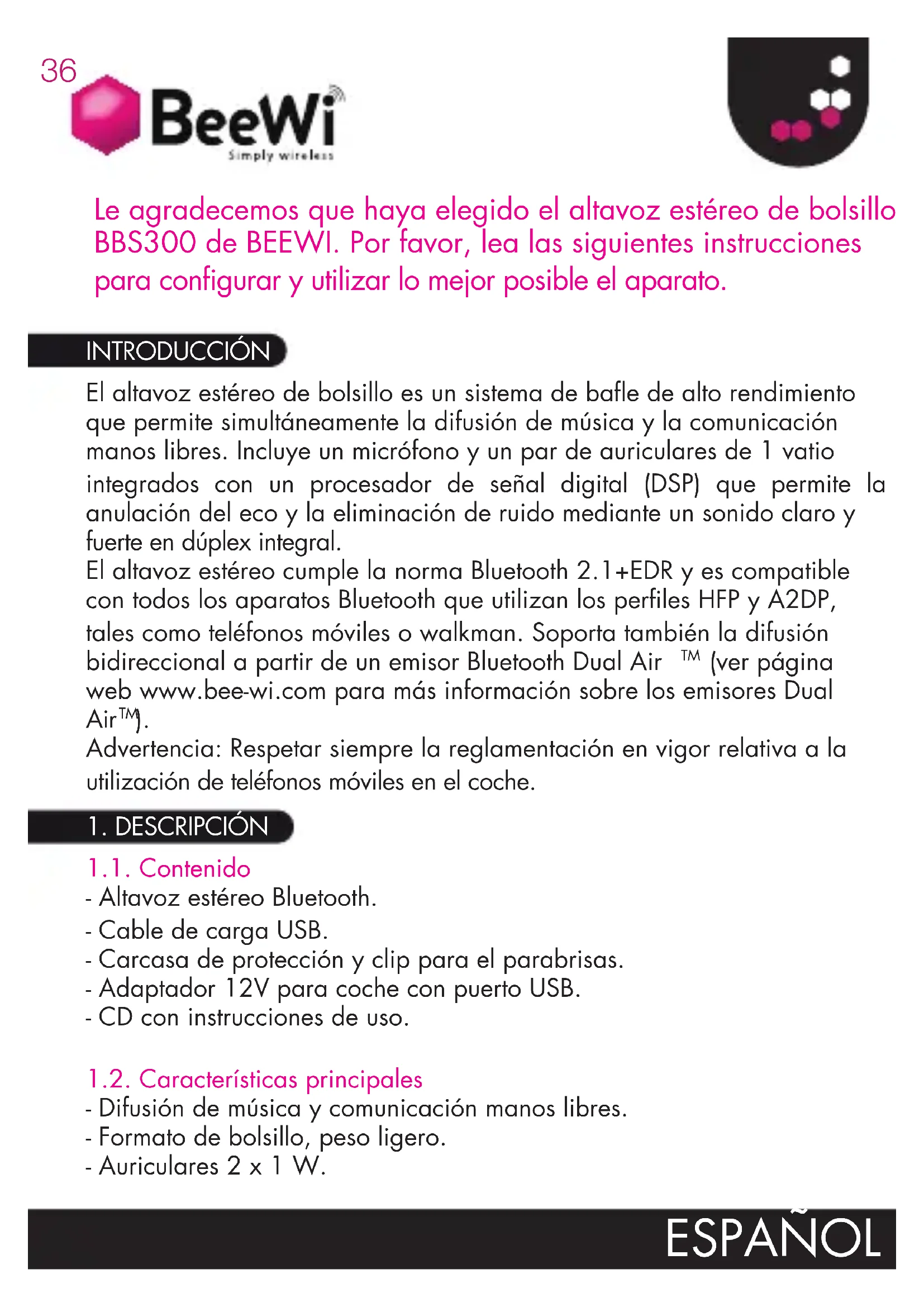 Advertencia: Respetar siempre la reglamentación en vigor relativa a la utilización de teléfonos móviles en el coche. 1.1. Contenido - Altavoz estéreo Bluetooth. - Cable de carga USB. - Carcasa de protección y clip para el parabrisas. - Adaptador 12V para coche con puerto USB. - CD con instrucciones de uso. 1.2. Características principales - Difusión de música y comunicación manos libres. - Formato de bolsillo, peso ligero. - Auriculares 2 x 1 W. INTRODUCCIÓN Le agradecemos que haya elegido el altavoz estéreo de bolsillo BBS300 de BEEWI. Por favor, lea las siguientes instrucciones para configurar y utilizar lo mejor posible el aparato.