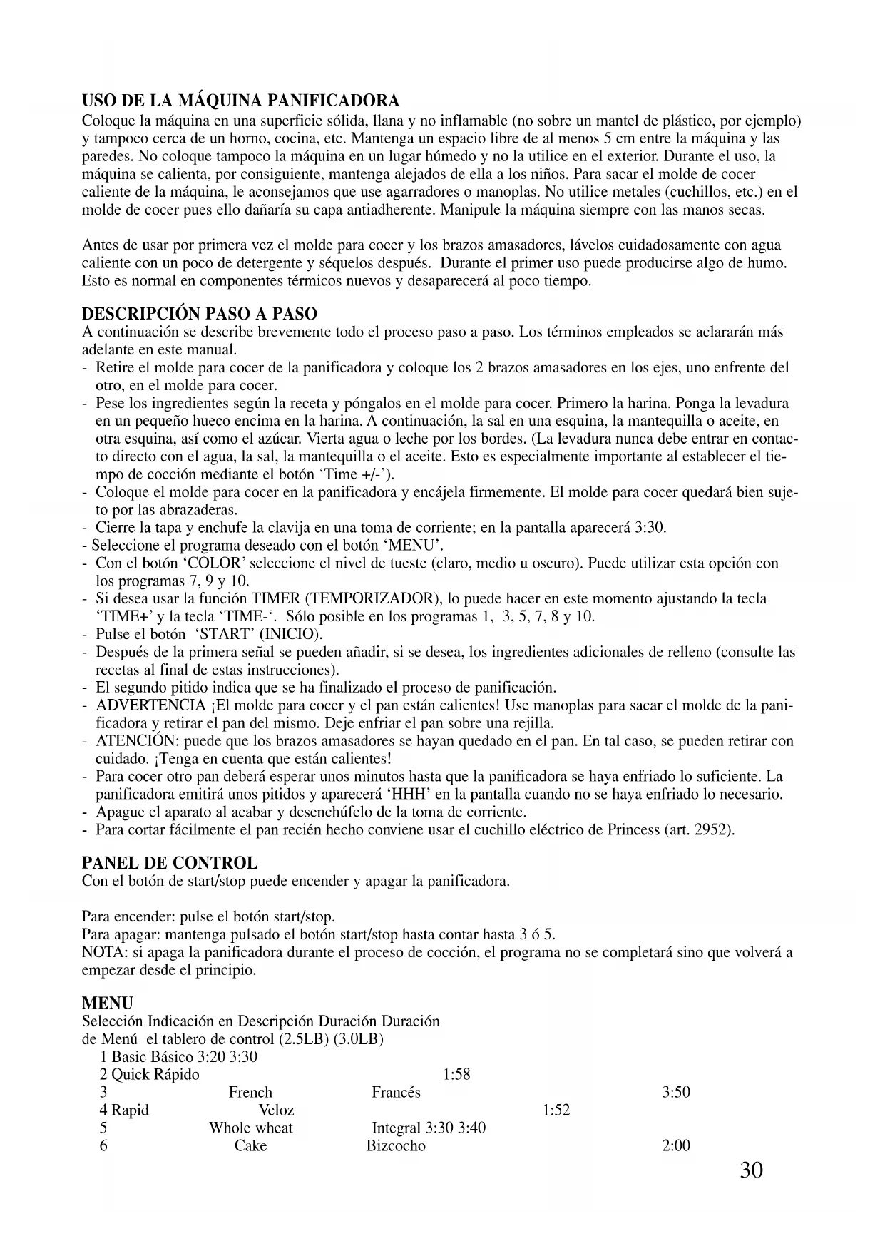 A continuación se describe brevemente todo el proceso paso a paso. Los términos empleados se aclararán más adelante en este manual. - Retire el molde para cocer de la panificadora y coloque los 2 brazos amasadores en los ejes, uno enfrente del otro, en el molde para cocer. - Pese los ingredientes según la receta y póngalos en el molde para cocer. Primero la harina. Ponga la levadura en un pequeño hueco encima en la harina. A continuación, la sal en una esquina, la mantequilla o aceite, en otra esquina, así como el azúcar. Vierta agua o leche por los bordes. (La levadura nunca debe entrar en contac- to directo con el agua, la sal, la mantequilla o el aceite. Esto es especialmente importante al establecer el tie- mpo de cocción mediante el botón ‘Time +/-’). - Coloque el molde para cocer en la panificadora y encájela firmemente. El molde para cocer quedará bien suje- to por las abrazaderas. - Cierre la tapa y enchufe la clavija en una toma de corriente; en la pantalla aparecerá 3:30. - Seleccione el programa deseado con el botón ‘MENU’. - Con el botón ‘COLOR’ seleccione el nivel de tueste (claro, medio u oscuro). Puede utilizar esta opción con los programas 7, 9 y 10. - Si desea usar la función TIMER (TEMPORIZADOR), lo puede hacer en este momento ajustando la tecla ‘TIME+’ y la tecla ‘TIME-‘. Sólo posible en los programas 1, 3, 5, 7, 8 y 10. - Pulse el botón ‘START’ (INICIO). - Después de la primera señal se pueden añadir, si se desea, los ingredientes adicionales de relleno (consulte las recetas al final de estas instrucciones). - El segundo pitido indica que se ha finalizado el proceso de panificación. - ADVERTENCIA ¡El molde para cocer y el pan están calientes! Use manoplas para sacar el molde de la pani- ficadora y retirar el pan del mismo. Deje enfriar el pan sobre una rejilla. - ATENCIÓN: puede que los brazos amasadores se hayan quedado en el pan. En tal caso, se pueden retirar con cuidado. ¡Tenga en cuenta que están calientes! - Para cocer otro pan deberá esperar unos minutos hasta que la panificadora se haya enfriado lo suficiente. La panificadora emitirá unos pitidos y aparecerá ‘HHH’ en la pantalla cuando no se haya enfriado lo necesario. - Apague el aparato al acabar y desenchúfelo de la toma de corriente. - Para cortar fácilmente el pan recién hecho conviene usar el cuchillo eléctrico de Princess (art. 2952).