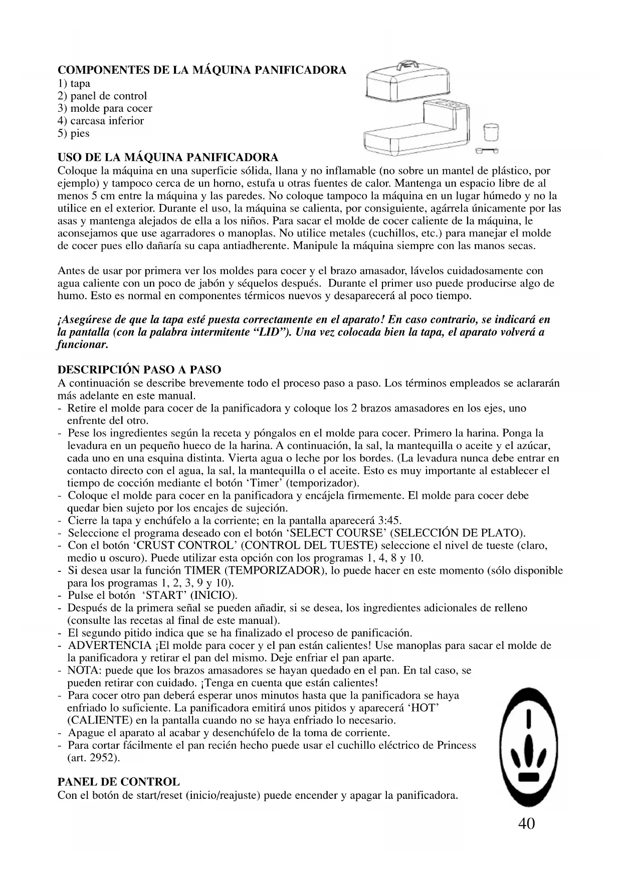A continuación se describe brevemente todo el proceso paso a paso. Los términos empleados se aclararán más adelante en este manual. - Retire el molde para cocer de la panificadora y coloque los 2 brazos amasadores en los ejes, uno enfrente del otro. - Pese los ingredientes según la receta y póngalos en el molde para cocer. Primero la harina. Ponga la levadura en un pequeño hueco de la harina. A continuación, la sal, la mantequilla o aceite y el azúcar, cada uno en una esquina distinta. Vierta agua o leche por los bordes. (La levadura nunca debe entrar en contacto directo con el agua, la sal, la mantequilla o el aceite. Esto es muy importante al establecer el tiempo de cocción mediante el botón ‘Timer’ (temporizador). - Coloque el molde para cocer en la panificadora y encájela firmemente. El molde para cocer debe quedar bien sujeto por los encajes de sujeción. - Cierre la tapa y enchúfelo a la corriente; en la pantalla aparecerá 3:45. - Seleccione el programa deseado con el botón ‘SELECT COURSE’ (SELECCIÓN DE PLATO). - Con el botón ‘CRUST CONTROL’ (CONTROL DEL TUESTE) seleccione el nivel de tueste (claro, medio u oscuro). Puede utilizar esta opción con los programas 1, 4, 8 y 10. - Si desea usar la función TIMER (TEMPORIZADOR), lo puede hacer en este momento (sólo disponible para los programas 1, 2, 3, 9 y 10). - Pulse el botón ‘START’ (INICIO). - Después de la primera señal se pueden añadir, si se desea, los ingredientes adicionales de relleno (consulte las recetas al final de este manual). - El segundo pitido indica que se ha finalizado el proceso de panificación. - ADVERTENCIA ¡El molde para cocer y el pan están calientes! Use manoplas para sacar el molde de la panificadora y retirar el pan del mismo. Deje enfriar el pan aparte. - NOTA: puede que los brazos amasadores se hayan quedado en el pan. En tal caso, se pueden retirar con cuidado. ¡Tenga en cuenta que están calientes! - Para cocer otro pan deberá esperar unos minutos hasta que la panificadora se haya enfriado lo suficiente. La panificadora emitirá unos pitidos y aparecerá ‘HOT’ (CALIENTE) en la pantalla cuando no se haya enfriado lo necesario. - Apague el aparato al acabar y desenchúfelo de la toma de corriente. - Para cortar fácilmente el pan recién hecho puede usar el cuchillo eléctrico de Princess (art. 2952).