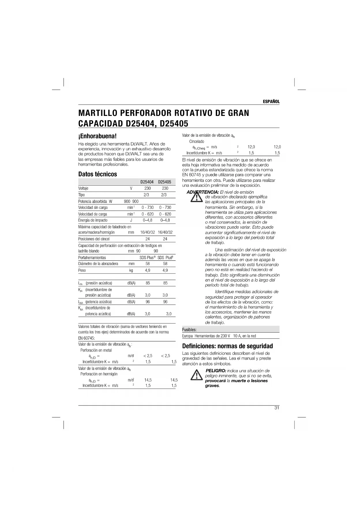 1,5 1,5 El nivel de emisión de vibración que se ofrece en esta hoja informativa se ha medido de acuerdo con la prueba estandarizada que ofrece la norma EN 60745 y puede utilizarse para comparar una herramienta con otra. Puede utilizarse para realizar una evaluación preliminar de la exposición. ADVERTENCIA: El nivel de emisión de vibración declarado ejemplifica las aplicaciones principales de la herramienta. Sin embargo, si la herramienta se utiliza para aplicaciones diferentes, con accesorios diferentes o mal conservados, la emisión de vibraciones puede variar. Esto puede aumentar significativamente el nivel de exposición a lo largo del período total de trabajo. Una estimación del nivel de exposición a la vibración debe tener en cuenta además las veces en que se apaga la herramienta o cuando está funcionando pero no está en realidad haciendo el trabajo. Esto significaría una disminución en el nivel de exposición a lo largo del período total de trabajo. Identifique medidas adicionales de seguridad para proteger al operador de los efectos de la vibración, como: el mantenimiento de la herramienta y los accesorios, mantener las manos calientes, organización de patrones de trabajo. Fusibles: Europa Herramientas de 230 V 10 A, en la red Defi niciones: normas de seguridad Las siguientes definiciones describen el nivel de gravedad de las señales. Lea el manual y preste atención a estos símbolos. PELIGRO: indica una situación de peligro inminente, que si no se evita, provocará la muerte o lesiones graves. ¡Enhorabuena! Ha elegido una herramienta DEWALT. Años de experiencia, innovación y un exhaustivo desarrollo de productos hacen que D EWALT sea una de las empresas más fiables para los usuarios de herramientas profesionales. Datos técnicos D25404 D25405 Voltaje V 230 230 Tipo 2/3 2/3 Potencia absorbida W 900 900 Velocidad sin carga min
