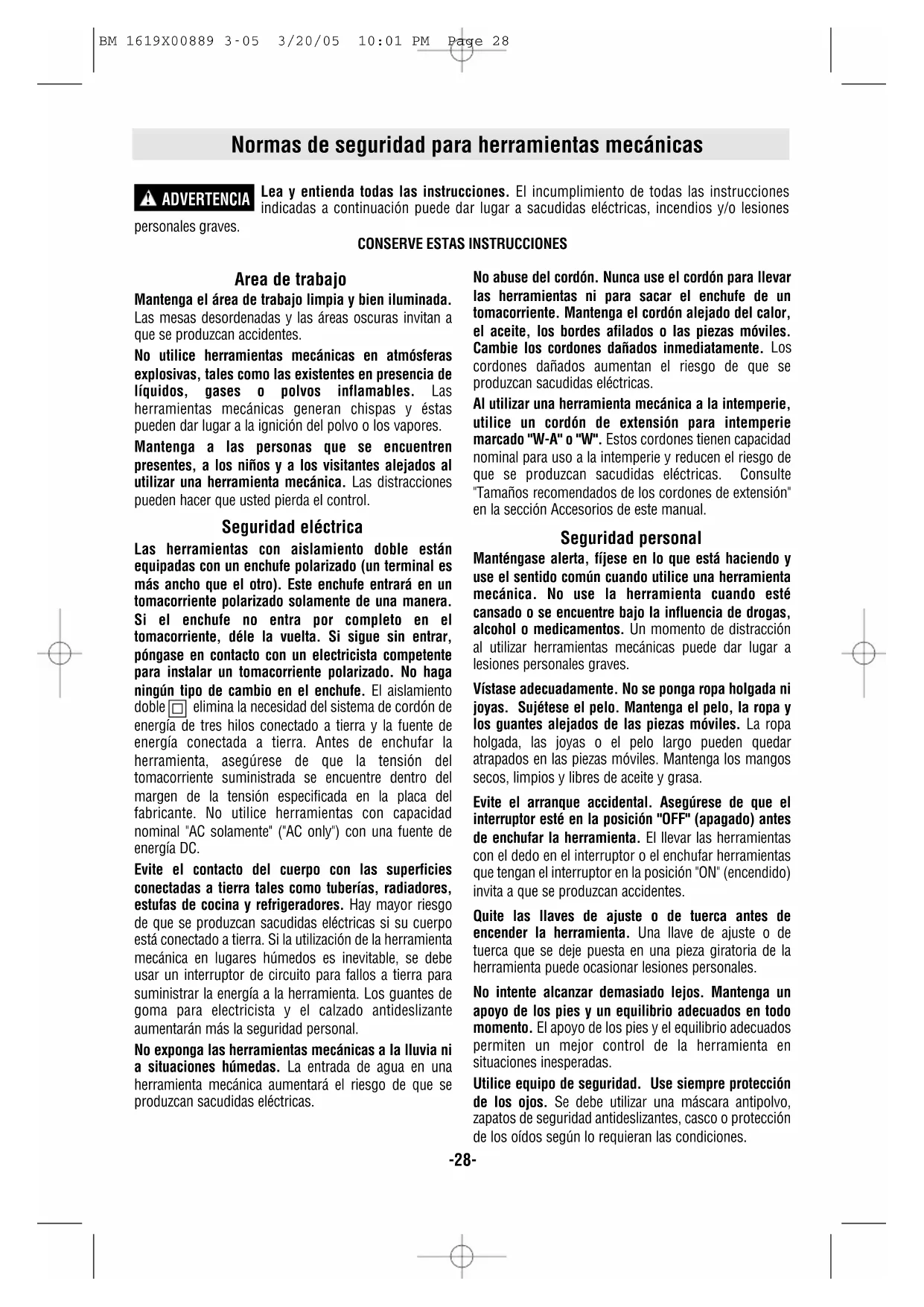 BM 1619X00889 3-05 3/20/05 10:01 PM Page 27-28- Lea y entienda todas las instrucciones. El incumplimiento de todas las instrucciones indicadas a continuación puede dar lugar a sacudidas eléctricas, incendios y/o lesiones personales graves.