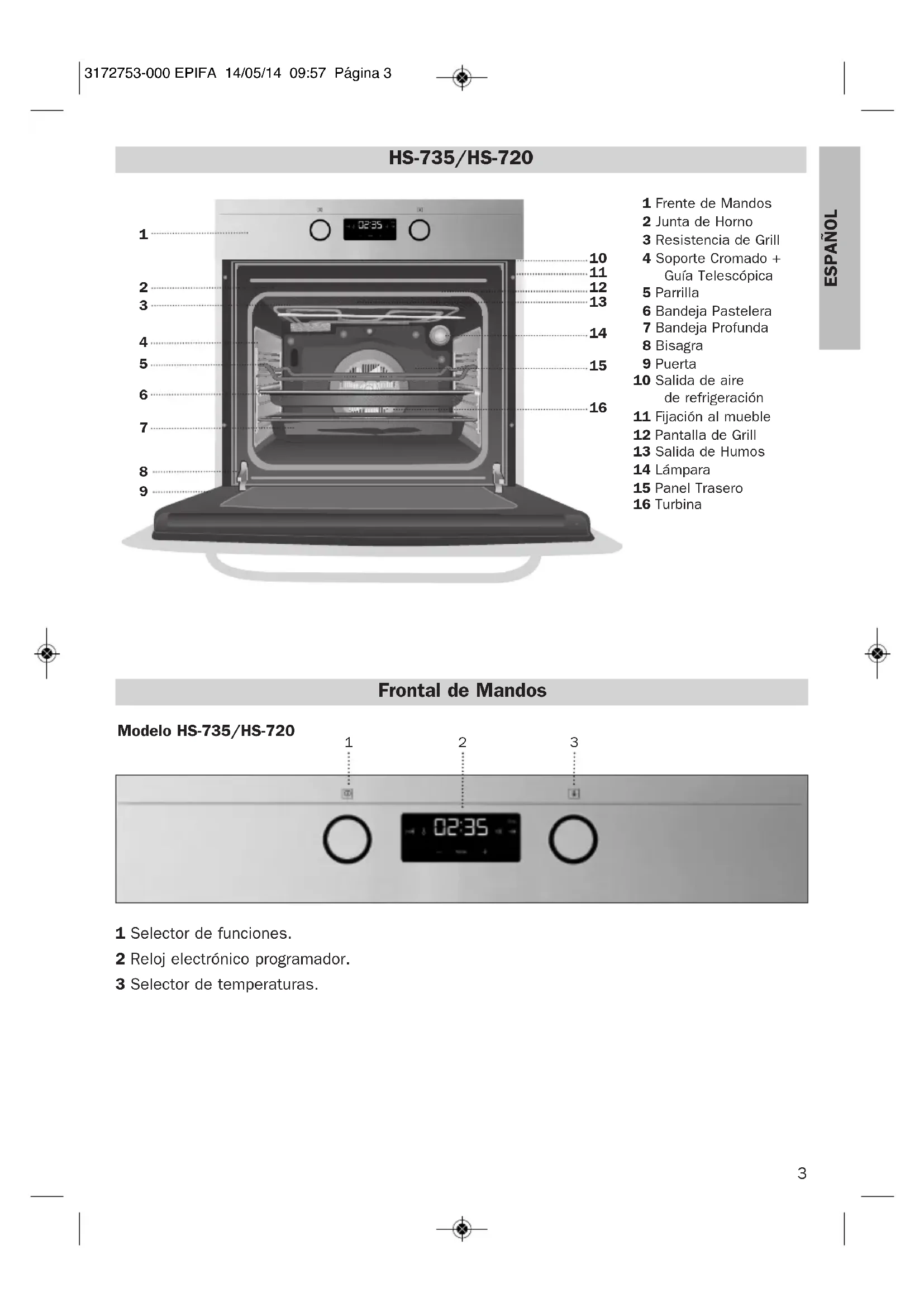 1 Selector de funciones. 2 Reloj electrónico programador. 3 Selector de temperaturas. Modelo HS-735/HS-720 Frontal de Mandos 3172753-000 EPIFA 14/05/14 09:57 Página 34 Funciones del Horno Desconexión del horno Convencional Se usa en bizcochos y tartas en los que el calor recibido debe ser uniforme y para que consigan una textura esponjosa. Grill y Solera Especial para asados. Puede usarse para cual- quier pieza, independiente de su tamaño. MaxiGrill Permite el gratinado en mayores superficies que en Grill, así como una mayor potencia de gratinado, obteniendo un dorado del alimento de forma más rápida. MaxiGrill con Turbina Permite el asado uniforme al mismo tiempo que dora superficialmente. Ideal para parrilla- das. Especial para piezas con gran volumen como aves, caza... Se recomienda colocar la pieza de carne sobre la parrilla del horno y la bandeja por debajo, para el escurrido de jugos o grasa. Grill Gratinado y asado superficial. Permite el do- rado de la capa exterior sin afectar al interior del alimento. Indicado para piezas planas como bistec, costillas, pescado, tostadas. Atención Durante el uso de la función Grill, MaxiGrill o MaxiGrill con Turbina la puerta debe mante- nerse cerrada. ECO Permite el cocinado de alimentos en su horno con un mínimo consumo energético. Mediante un calentamiento por convección forzada, el horno desconecta su funcionamiento unos mi- nutos antes de finalizar el cocinado permi- tiendo aprovechar el calor residual que existe dentro de la cavidad y obteniendo un acabado perfecto del alimento. Indicado para pescados y asados de todo tipo de carnes. Solera Calor sólo desde la parte inferior. Apropiado para calentar platos o levantar masas de re- postería y afines. Pizza Especial para cocinar pizzas, empanadas y pasteles o bizcochos rellenos de fruta. Turbo La turbina reparte el calor que proviene de una resistencia situada en la parte trasera del horno. Por la uniformidad de la temperatura que se produce, permite cocinar en 2 alturas al mismo tiempo. Descongelación Esta función es apropiada para descongela- ciones suaves de alimentos. En especial aque- llos que son consumidos sin calentar, por ejemplo cremas, pastas, tartas, pasteles, etc. Nota La lámpara permanece encendida en cualquier función de cocinado. 3172753-000 EPIFA 14/05/14 09:57 Página 45 ESPAÑOL Atención Su reloj electrónico incorpora tecnología Touch- Control. Para manejarlo es suficiente con tocar los símbolos del cristal con su dedo. La sensibilidad del Touch-Control se adapta con- tinuamente a las condiciones ambientales. Al conectar el horno a la red tenga la precaución que la superficie del cristal del frontal de man- dos esté limpia y libre de cualquier obstáculo. Si al tocar el cristal, el reloj no responde co- rrectamente entonces es necesario que desco- necte el horno de la red eléctrica y tras un instante vuelva a conectarlo. De esta forma los sensores se habrán ajustado automáticamente y reaccionarán de nuevo al tocar con el dedo. Puesta en Hora del Reloj Electrónico Al conectar su horno, observará que en el reloj aparece parpadeando la indicación 12:00. Pulsando las teclas ó pondrá el reloj en hora; a continuación escuchará 2 beep segui- dos como confirmación de la hora elegida. Si desea modificar la hora, pulse las teclas ó hasta que parpadee la hora actual. A continuación pulse la tecla . Pulsando las teclas ó podrá modificar la hora. Finalmente escuchará 2 beep seguidos como confirmación del cambio realizado. Funcionamiento Manual Tras poner el reloj en hora, su horno está listo para cocinar. Seleccione una función de coci- nado y una temperatura. Durante el cocinado observará que el símbolo se ilumina para indicar la transmisión de calor al alimento. Este símbolo se apaga cuan- do se alcanza la temperatura seleccionada. Para apagar el horno, ponga los mandos en posición . Funciones del Reloj Electrónico Avisador: Genera una señal acústica al cabo del tiempo, para ello no es necesario que el horno esté cocinando. Duración del Cocinado: Permite cocinar duran- te un tiempo seleccionado, a continuación el horno se apagará de forma automática. Hora de Finalización del Cocinado: Permite cocinar hasta una hora establecida, a conti- nuación el horno se apagará de forma auto- mática. Duración y Fin del Cocinado: Permite progra- mar la duración y la hora de finalización del cocinado. Con esta función el horno se pondrá en marcha de forma automática a la hora necesaria para cocinar durante el tiempo seleccionado (Duración) y finalizando de forma automática a la hora que le hayamos indicado (Fin del Cocinado). Función Seguridad Niños. Esta función blo- quea el reloj electrónico, evitando la manipula- ción por parte de niños pequeños. Programación del Avisador 1 Pulse la tecla hasta que el símbolo se ilumine. A continuación pulse la tecla . 2 Seleccione el tiempo tras el cual desea que el reloj avise, pulsando las teclas ó . 3 Posteriormente sonarán 2 beep seguidos y el símbolo permanecerá iluminado, indi- cando que el avisador ya está programado. 4 Transcurrido el tiempo programado, sonará una señal acústica y el símbolo empe- zará a parpadear. 5 Pulse cualquier tecla para detener la señal acústica, en ese momento el símbolo se apagará. En cualquier momento usted puede visualizar el tiempo restante, pulsando las teclas ó hasta que el símbolo parpadee y pul- sando luego la tecla . En ese momento usted puede modificar el tiempo seleccionado pulsando las teclas ó . A continuación escuchará 2 beep segui- dos como confirmación del cambio. Manejo del Horno 3172753-000 EPIFA 14/05/14 09:57 Página 56 Programación de la Duración del Cocinado 1 Pulse las teclas ó hasta que el sím- bolo se ilumine. A continuación pulse la tecla . 2 Seleccione la duración, pulsando las teclas