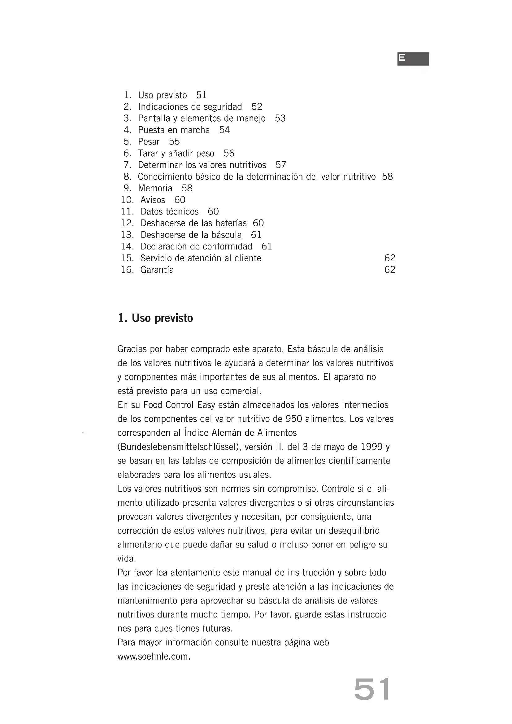 Gracias por haber comprado este aparato. Esta báscula de análisis de los valores nutritivos le ayudará a determinar los valores nutritivos y componentes más importantes de sus alimentos. El aparato no está previsto para un uso comercial. En su Food Control Easy están almacenados los valores intermedios de los componentes del valor nutritivo de 950 alimentos. Los valores corresponden al Índice Alemán de Alimentos (Bundeslebensmittelschlüssel), versión II. del 3 de mayo de 1999 y se basan en las tablas de composición de alimentos científicamente elaboradas para los alimentos usuales. Los valores nutritivos son normas sin compromiso. Controle si el ali- mento utilizado presenta valores divergentes o si otras circunstancias provocan valores divergentes y necesitan, por consiguiente, una corrección de estos valores nutritivos, para evitar un desequilibrio alimentario que puede dañar su salud o incluso poner en peligro su vida. Por favor lea atentamente este manual de ins-trucción y sobre todo las indicaciones de seguridad y preste atención a las indicaciones de mantenimiento para aprovechar su báscula de análisis de valores nutritivos durante mucho tiempo. Por favor, guarde estas instruccio- nes para cues-tiones futuras. Para mayor información consulte nuestra página web www.soehnle.com.52