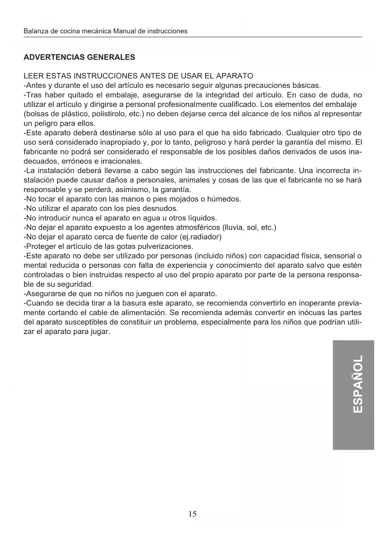 -Cuando se decida tirar a la basura este aparato, se recomienda convertirlo en inoperante previamente cortando el cable de alimentación. Se recomienda además convertir en inócuas las partes del aparato susceptibles de constituir un problema, especialmente para los niños que podrían utilizar el aparato para jugar.