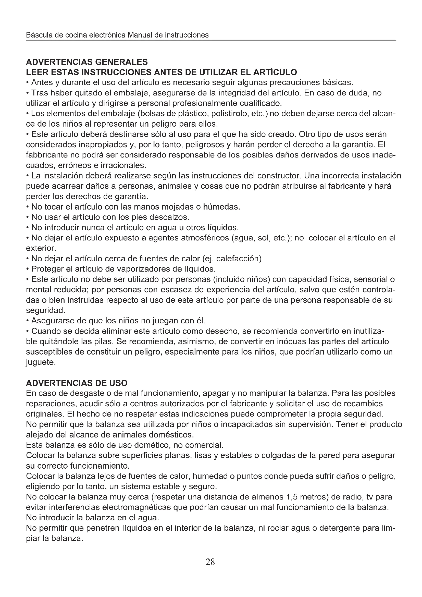 En caso de desgaste o de mal funciona, apagar y no Manipular la balanza. Para las posibles reparaciones, acudir solo a centros autorizados por el fabricante y Solicitar el uso de recambios originales. El着他 de no respetar estas indicacionesuede comprometer la propia seguridad. No permitir que la balanza seautilizada por niños o incapacitados sin supervision.Tener el producto alejado del alcance de animales domesticos.