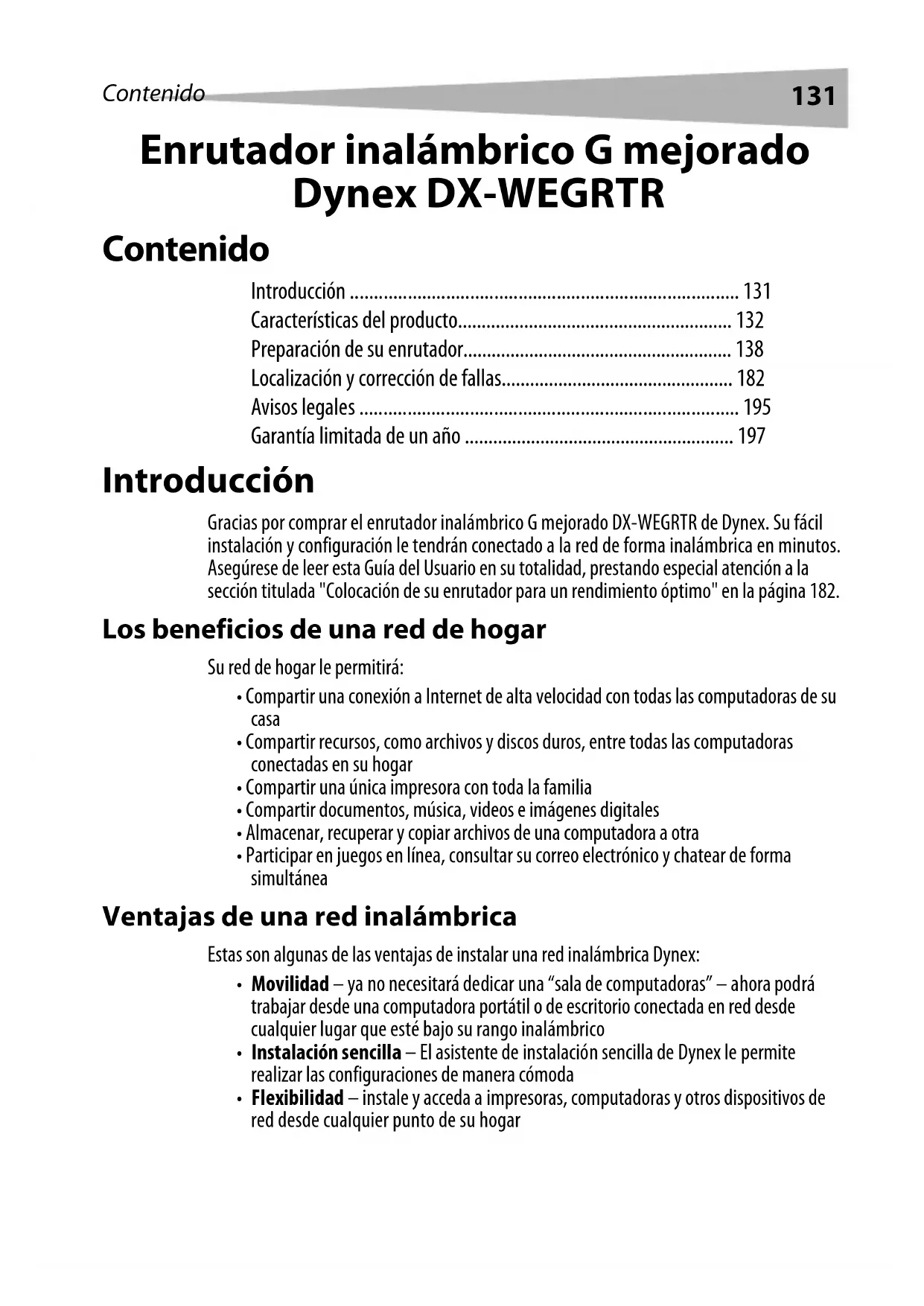 - Garantía limitada de un año Introducción Gracias por comprar el enrutador inalámbrico G mejorado DX-WEGRTR de Dynex. Su fácil instalación y configuración le tendrán conectado a la red de forma inalámbrica en minutos. Asegúrese de leer esta Guía del Usuario en su totalidad, prestando especial atención a la sección titulada "Colocación de su enrutador para un rendimiento óptimo" en la página 182. Los beneficios de una red de hogar Su red de hogar le permitirá: p. 197