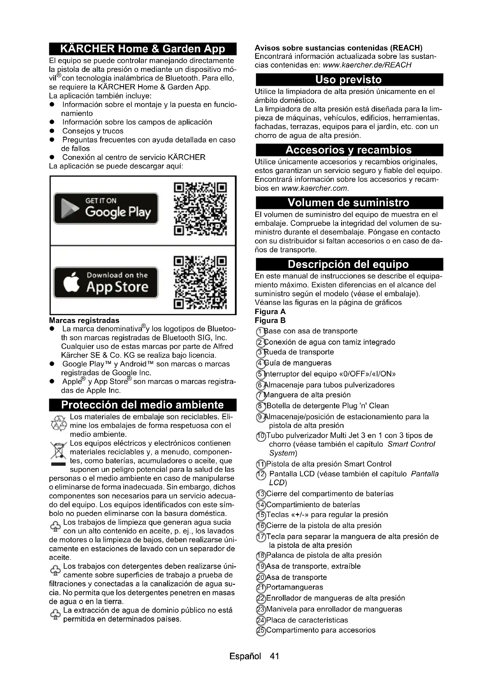 son marcas o marcas registra- das de Apple Inc. Protección del medio ambiente Los materiales de embalaje son reciclables. Eli- mine los embalajes de forma respetuosa con el medio ambiente. Los equipos eléctricos y electrónicos contienen materiales reciclables y, a menudo, componen- tes, como baterías, acumuladores o aceite, que suponen un peligro potencial para la salud de las personas o el medio ambiente en caso de manipularse o eliminarse de forma inadecuada. Sin embargo, dichos componentes son necesarios para un servicio adecua- do del equipo. Los equipos identificados con este sím- bolo no pueden eliminarse con la basura doméstica. Los trabajos de limpieza que generan agua sucia con un alto contenido en aceite, p. ej., los lavados de motores o la limpieza de bajos, deben realizarse úni- camente en estaciones de lavado con un separador de aceite. Los trabajos con detergentes deben realizarse úni- camente sobre superficies de trabajo a prueba de filtraciones y conectadas a la canalización de agua su- cia. No permita que los detergentes penetren en masas de agua o en la tierra. La extracción de agua de dominio público no está permitida en determinados países. Avisos sobre sustancias contenidas (REACH) Encontrará información actualizada sobre las sustan- cias contenidas en: www.kaercher.de/REACH Uso previsto Utilice la limpiadora de alta presión únicamente en el ámbito doméstico. La limpiadora de alta presión está diseñada para la lim- pieza de máquinas, vehículos, edificios, herramientas, fachadas, terrazas, equipos para el jardín, etc. con un chorro de agua de alta presión. Accesorios y recambios Utilice únicamente accesorios y recambios originales, estos garantizan un servicio seguro y fiable del equipo. Encontrará información sobre los accesorios y recam- bios en www.kaercher.com. Volumen de suministro El volumen de suministro del equipo de muestra en el embalaje. Compruebe la integridad del volumen de su- ministro durante el desembalaje. Póngase en contacto con su distribuidor si faltan accesorios o en caso de da- ños de transporte. Descripción del equipo En este manual de instrucciones se describe el equipa- miento máximo. Existen diferencias en el alcance del suministro según el modelo (véase el embalaje). Véanse las figuras en la página de gráficos Figura A Figura B 1 Base con asa de transporte 2 Conexión de agua con tamiz integrado 3 Rueda de transporte 4 Guía de mangueras 5 Interruptor del equipo «0/OFF»/«I/ON» 6 Almacenaje para tubos pulverizadores 7 Manguera de alta presión 8 *Botella de detergente Plug 'n' Clean 9 Almacenaje/posición de estacionamiento para la pistola de alta presión 10 Tubo pulverizador Multi Jet 3 en 1 con 3 tipos de chorro (véase también el capítulo Smart Control System) 11 Pistola de alta presión Smart Control 12 Pantalla LCD (véase también el capítulo Pantalla LCD) 13 Cierre del compartimento de baterías 14 Compartimiento de baterías 15 Teclas «+/-» para regular la presión 16 Cierre de la pistola de alta presión 17 Tecla para separar la manguera de alta presión de la pistola de alta presión 18 Palanca de pistola de alta presión 19 Asa de transporte, extraíble 20 Asa de transporte 21 Portamangueras 22 Enrollador de mangueras de alta presión 23 Manivela para enrollador de mangueras 24 Placa de características 25 Compartimento para accesorios42 Español 26 Ganchos para la fijación de red 27 Red para compartimento para accesorios 28 Cable de conexión de red con conector de red 29 Acoplamiento de la conexión de agua 30 **Manguera de riego (reforzada con tela, diámetro de al menos 1/2 pulgadas (13 mm), longitud de al menos 7,5 m, con acoplamiento de acción rápida convencional) 31 **Manguera de aspiración KÄRCHER para alimen- tación de agua de recipientes abiertos (n.º de refe- rencia 2.643-100.0)