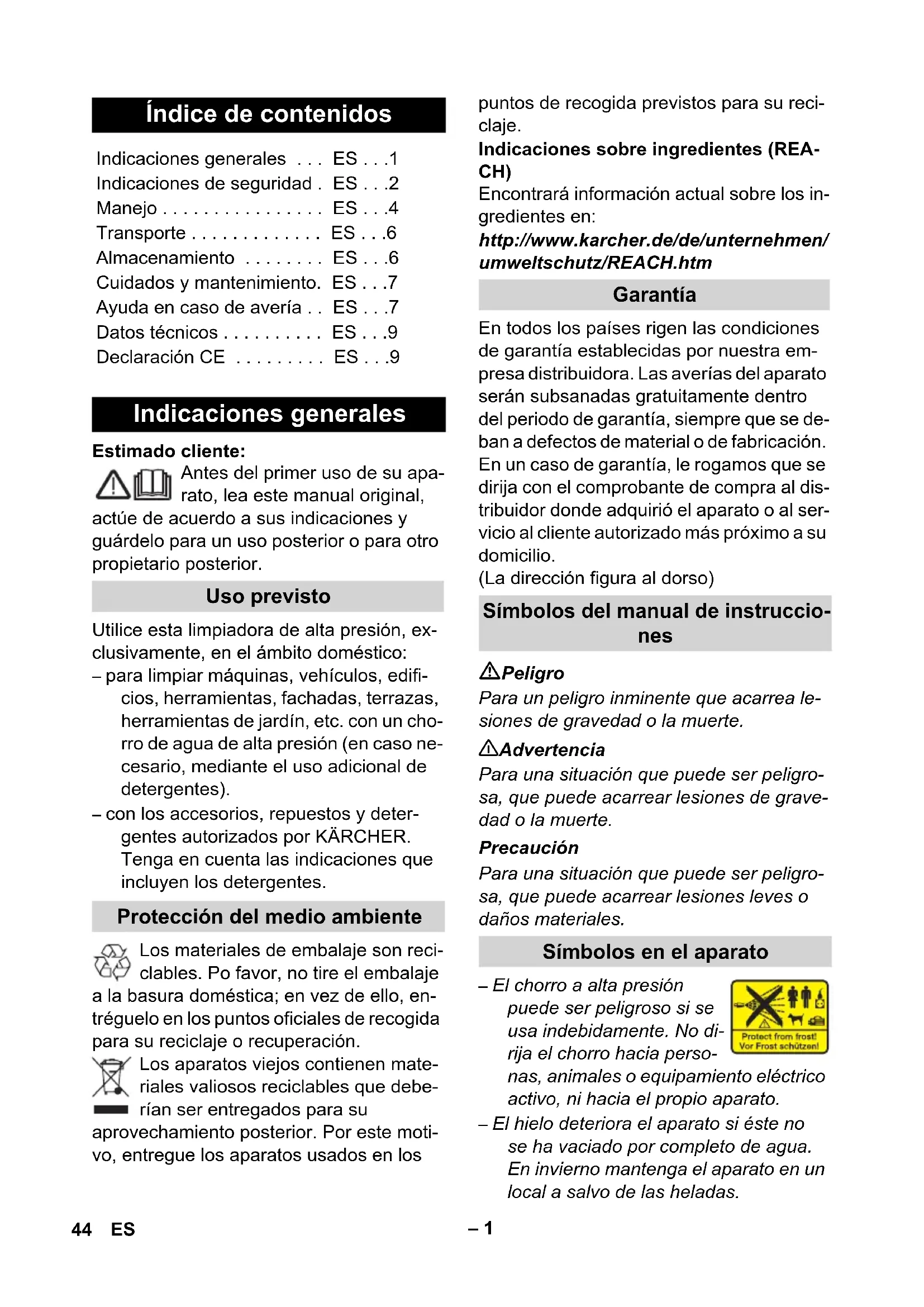 • dB(A) 93 CE-verklaring Product: Hogedrukreiniger Type: 1.950-xxx Van toepassing zijnde EG-richtlijnen 2006/42/EG (+2009/127/EG) 2004/108//EG 2000/14/EG Toegepaste geharmoniseerde normen EN 55014–1: 2006 + A1: 2009 EN 55014–2: 1997 + A2: 2008 EN 60335–1 EN 60335–2–79 EN 61000–3–2: 2006 + A2: 2009 EN 61000–3–3: 2008 EN 62233: 2008 Toegepaste conformiteitsbeoordelings- procedure 2000/14/EG: Bijlage V Geluidsvermogensniveau dB(A) Gemeten: 91 Gegarandeerd: 93 CEO Head of Approbation 43NL– 1 Estimado cliente: Antes del primer uso de su apa- rato, lea este manual original, actúe de acuerdo a sus indicaciones y guárdelo para un uso posterior o para otro propietario posterior. Utilice esta limpiadora de alta presión, ex- clusivamente, en el ámbito doméstico: – para limpiar máquinas, vehículos, edifi- cios, herramientas, fachadas, terrazas, herramientas de jardín, etc. con un cho- rro de agua de alta presión (en caso ne- cesario, mediante el uso adicional de detergentes). – con los accesorios, repuestos y deter- gentes autorizados por KÄRCHER. Tenga en cuenta las indicaciones que incluyen los detergentes. Los materiales de embalaje son reci- clables. Po favor, no tire el embalaje a la basura doméstica; en vez de ello, en- tréguelo en los puntos oficiales de recogida para su reciclaje o recuperación. Los aparatos viejos contienen mate- riales valiosos reciclables que debe- rían ser entregados para su aprovechamiento posterior. Por este moti- vo, entregue los aparatos usados en los puntos de recogida previstos para su reci- claje. Indicaciones sobre ingredientes (REA- CH) Encontrará información actual sobre los in- gredientes en: http://www.karcher.de/de/unternehmen/ umweltschutz/REACH.htm En todos los países rigen las condiciones de garantía establecidas por nuestra em- presa distribuidora. Las averías del aparato serán subsanadas gratuitamente dentro del periodo de garantía, siempre que se de- ban a defectos de material o de fabricación. En un caso de garantía, le rogamos que se dirija con el comprobante de compra al dis- tribuidor donde adquirió el aparato o al ser- vicio al cliente autorizado más próximo a su domicilio. (La dirección figura al dorso) Peligro Para un peligro inminente que acarrea le- siones de gravedad o la muerte. 몇 Advertencia Para una situación que puede ser peligro- sa, que puede acarrear lesiones de grave- dad o la muerte. Precaución Para una situación que puede ser peligro- sa, que puede acarrear lesiones leves o daños materiales. – El chorro a alta presión puede ser peligroso si se usa indebidamente. No di- rija el chorro hacia perso- nas, animales o equipamiento eléctrico activo, ni hacia el propio aparato. – El hielo deteriora el aparato si éste no se ha vaciado por completo de agua. En invierno mantenga el aparato en un local a salvo de las heladas. Índice de contenidos Indicaciones generales