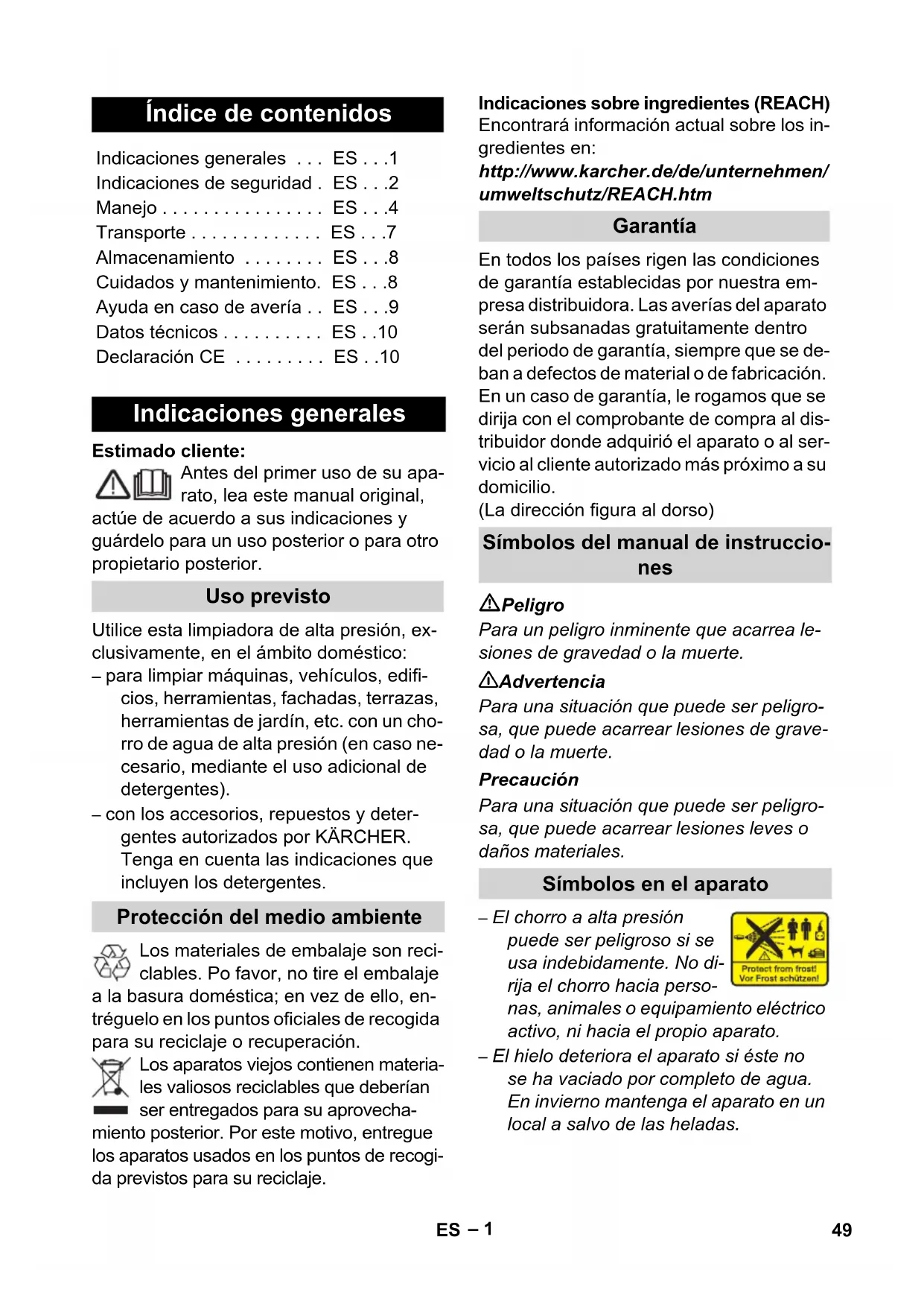 - dB(A) 89 CE-verklaring Product: Hogedrukreiniger Type: 1.180-xxx 1.181-xxx Van toepassing zijnde EG-richtlijnen 2006/42/EG (+2009/127/EG) 2004/108//EG 2000/14/EG Toegepaste geharmoniseerde normen EN 55014–1: 2006 + A1: 2009 EN 55014–2: 1997 + A2: 2008 EN 60335–1 EN 60335–2–79 EN 61000–3–2: 2006 + A2: 2009 EN 61000–3–3: 2008 EN 62233: 2008 Toegepaste conformiteitsbeoordelings- procedure 2000/14/EG: Bijlage V Geluidsvermogensniveau dB(A) Gemeten: 87 Gegarandeerd: 89 CEO Head of Approbation 48 NL– 1 Estimado cliente: Antes del primer uso de su apa- rato, lea este manual original, actúe de acuerdo a sus indicaciones y guárdelo para un uso posterior o para otro propietario posterior. Utilice esta limpiadora de alta presión, ex- clusivamente, en el ámbito doméstico: – para limpiar máquinas, vehículos, edifi- cios, herramientas, fachadas, terrazas, herramientas de jardín, etc. con un cho- rro de agua de alta presión (en caso ne- cesario, mediante el uso adicional de detergentes). – con los accesorios, repuestos y deter- gentes autorizados por KÄRCHER. Tenga en cuenta las indicaciones que incluyen los detergentes. Los materiales de embalaje son reci- clables. Po favor, no tire el embalaje a la basura doméstica; en vez de ello, en- tréguelo en los puntos oficiales de recogida para su reciclaje o recuperación. Los aparatos viejos contienen materia- les valiosos reciclables que deberían ser entregados para su aprovecha- miento posterior. Por este motivo, entregue los aparatos usados en los puntos de recogi- da previstos para su reciclaje. Indicaciones sobre ingredientes (REACH) Encontrará información actual sobre los in- gredientes en: http://www.karcher.de/de/unternehmen/ umweltschutz/REACH.htm En todos los países rigen las condiciones de garantía establecidas por nuestra em- presa distribuidora. Las averías del aparato serán subsanadas gratuitamente dentro del periodo de garantía, siempre que se de- ban a defectos de material o de fabricación. En un caso de garantía, le rogamos que se dirija con el comprobante de compra al dis- tribuidor donde adquirió el aparato o al ser- vicio al cliente autorizado más próximo a su domicilio. (La dirección figura al dorso) Peligro Para un peligro inminente que acarrea le- siones de gravedad o la muerte. 몇 Advertencia Para una situación que puede ser peligro- sa, que puede acarrear lesiones de grave- dad o la muerte. Precaución Para una situación que puede ser peligro- sa, que puede acarrear lesiones leves o daños materiales. – El chorro a alta presión puede ser peligroso si se usa indebidamente. No di- rija el chorro hacia perso- nas, animales o equipamiento eléctrico activo, ni hacia el propio aparato. – El hielo deteriora el aparato si éste no se ha vaciado por completo de agua. En invierno mantenga el aparato en un local a salvo de las heladas. Índice de contenidos Indicaciones generales