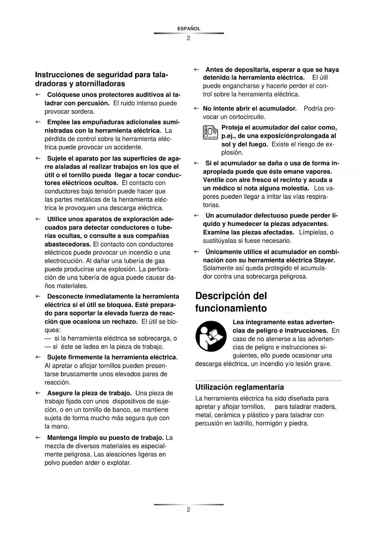 Unicamente utilise el acumulador en combinación con su herramienta electrica Stayer. Solamente así queda protegid el acumulador contra una sobrecarga peligrosa.