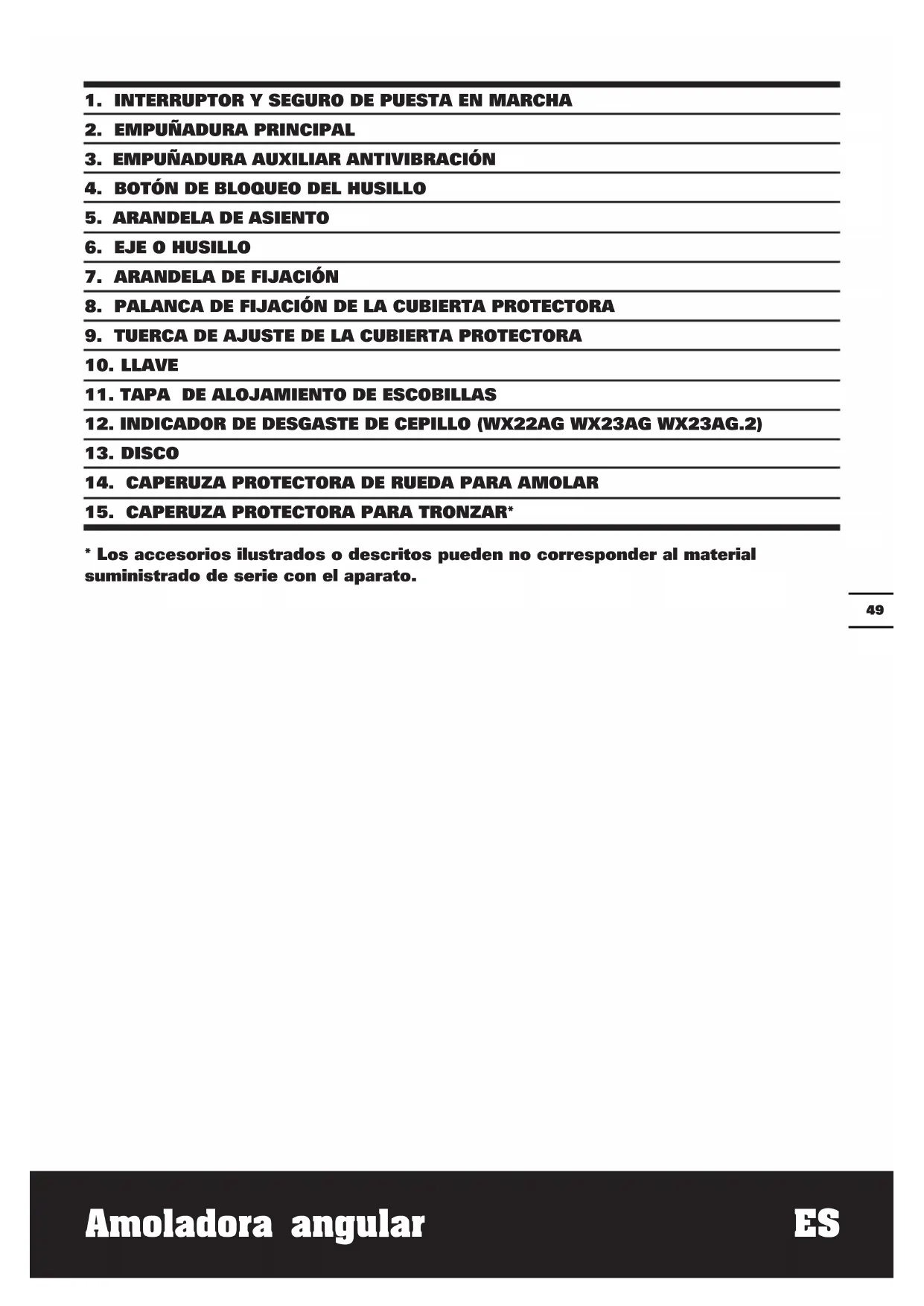 Incertidumbre K = 1.5m/s² ADVERTENCIA: El valor de emisión de vibraciones durante el uso de la herramienta podría diferir del valor declarado dependiendo de la forma en que se use la herramienta según los ejemplos siguientes, y otras variaciones sobre el uso de la herramienta: Cómo se utiliza la herramienta y se perforan los materiales. Si la herramienta se encuentra en buenas condiciones de mantenimiento. Si se utiliza el accesorio correcto para la herramienta y se garantiza que está afilado y en buenas condiciones. Si se agarran las asas firmemente y se utilizan accesorios antivibración. Y si la herramienta se utiliza según su diseño y estas instrucciones. Esta herramienta podría causar síndrome de vibración del brazo y la mano si no se utiliza correctamente.5150 Amoladora angular ES ADVERTENCIA: Para conseguir una mayor precisión, debe tenerse en cuenta una estimación del nivel de exposición en condiciones reales de todas las partes del ciclo de uso, como los tiempos durante los que la herramienta está apagado o cuando esta en funcionamiento pero no está realizando ningún trabajo. Ello podría reducir notablemente el nivel de exposición sobre el periodo de carga total. Ayuda a minimizar el riesgo de exposición a la vibración. Mantenga esta herramienta de acuerdo con estas instrucciones y bien lubricada (si es necesario). Si la herramienta se utiliza regularmente, invierta en accesorios antivibración. Evite el uso de herramientas a temperaturas de 10ºC o menos. Planifique su programa de trabajo para distribuir el uso de la herramienta a lo largo de varios días. ACCESORIOS Llave 1 Empuñadura auxiliar 1 disco abrasivo metal (WX22AG WX23AG WX23AG.1) 1 Recomendamos que adquiera todos sus accesorios en el mismo lugar donde compró la herramienta. Utilice accesorios de buena calidad y de marca reconocida. Consulte la sección “Consejos de trabajo” de este manual o en los estuches de los accesorios para más detalles.Amoladora angular ES